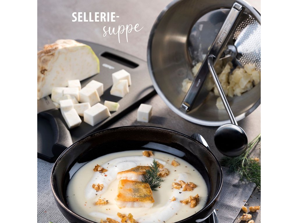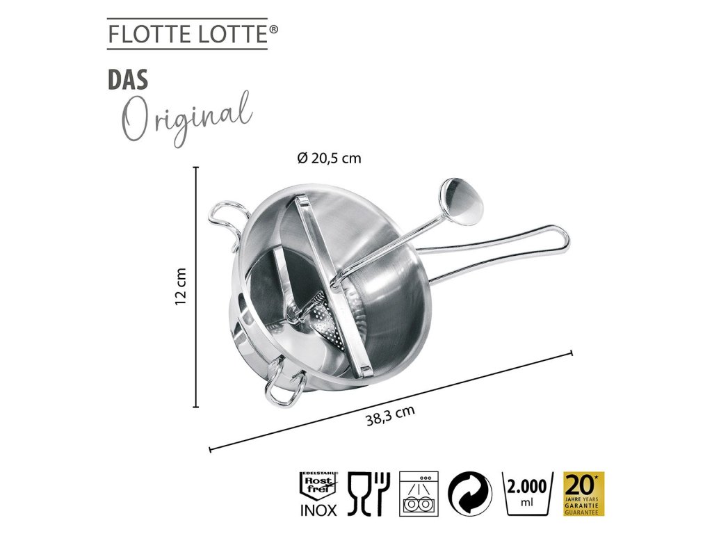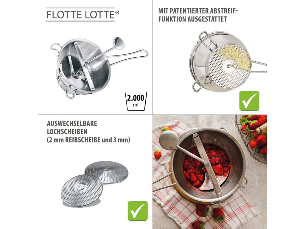 Multifunkční mlýnek FLOTTE LOTTE® je nepostradatelným pomocníkem všude tam, kde je potřeba jemné pyré, hladká omáčka nebo dokonale zpracované ovoce a zelenina. Tato klasická kuchyňská pomůcka je vybavena dvěma jednoduše vyměnitelnými perforovanými disky o průměrech 2 mm a 3 mm, které rozšiřují možnosti přípravy. Disk s 2mm třecí plochou si poradí i s vláknitými potravinami, jako je pórek nebo celer.