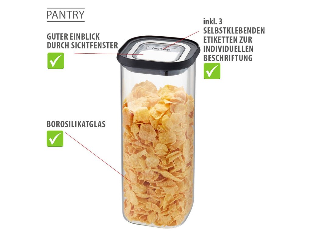 Nádoba je vyrobena z kvalitního borosilikátového skla, které je chuťově neutrální, lehké a velmi odolné. Díky stohovatelnému provedení šetří místo a lze ji snadno kombinovat s dalšími velikostmi z řady PANTRY. Součástí balení jsou tři samolepicí štítky, které umožňují přehledné a individuální označení obsahu.