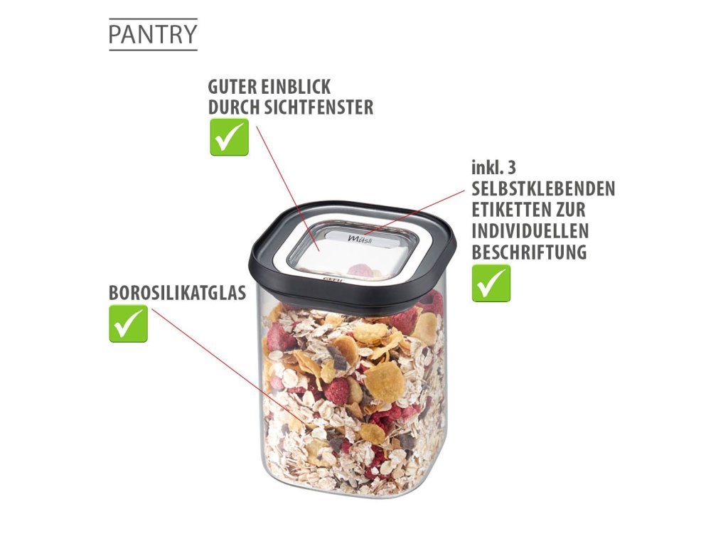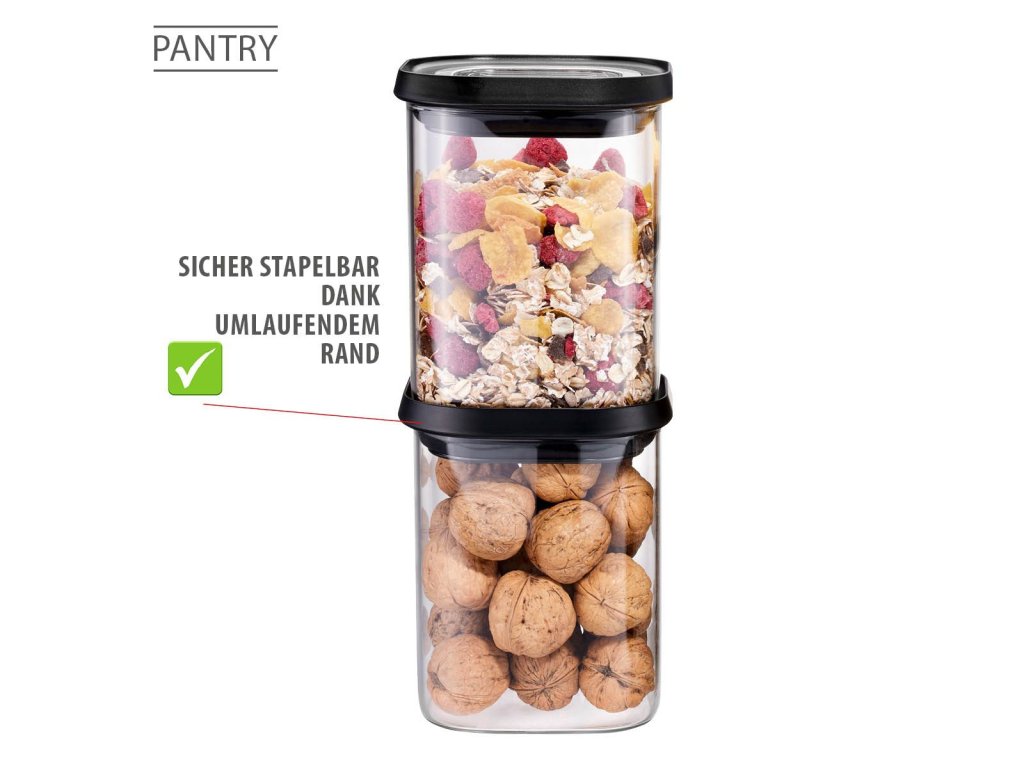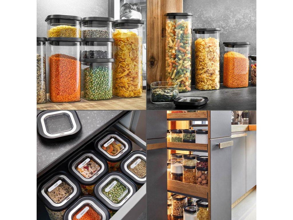 Každá nádoba je vybavena vzduchotěsným víkem se silikonovým těsněním, které chrání obsah před vlhkostí a ztrátou aroma. Průhledové okénko ve víku umožňuje rychlou kontrolu obsahu bez nutnosti otevírání. Díky stohovatelnému a individuálně kombinovatelnému provedení nádoby šetří místo a přispívají k přehledné organizaci kuchyně.