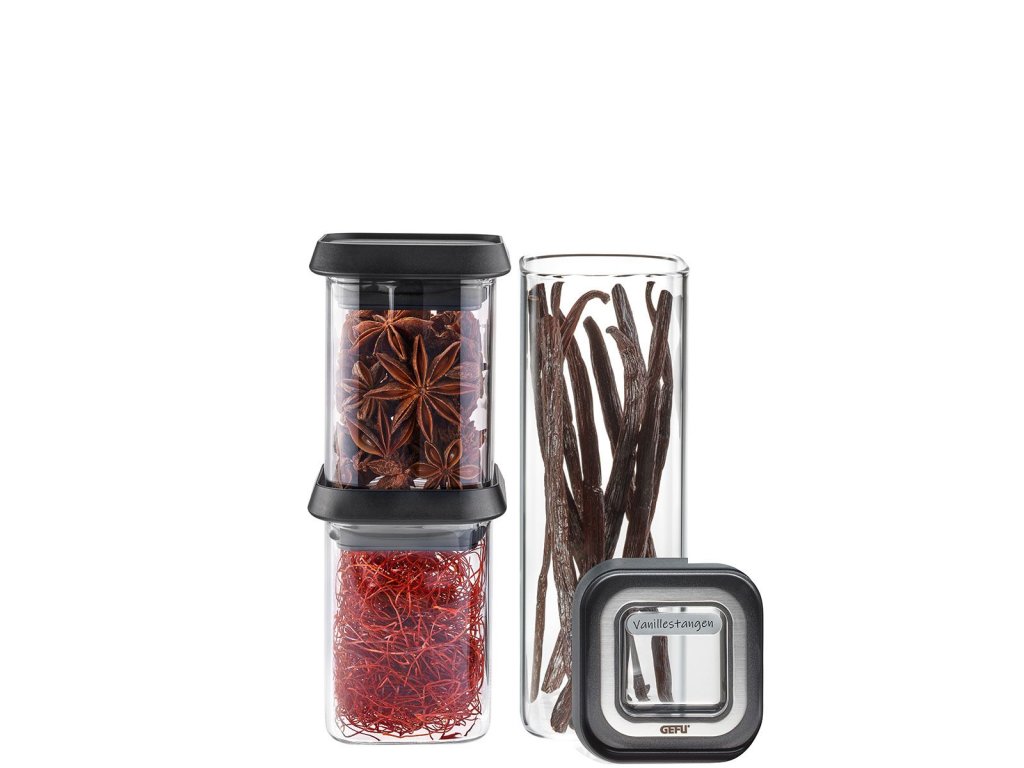 Nádoby jsou vyrobeny z kvalitního borosilikátového skla, které je chuťově neutrální a odolné. Součástí balení jsou tři samolepicí štítky, díky nimž lze každou nádobu snadno a přehledně označit.