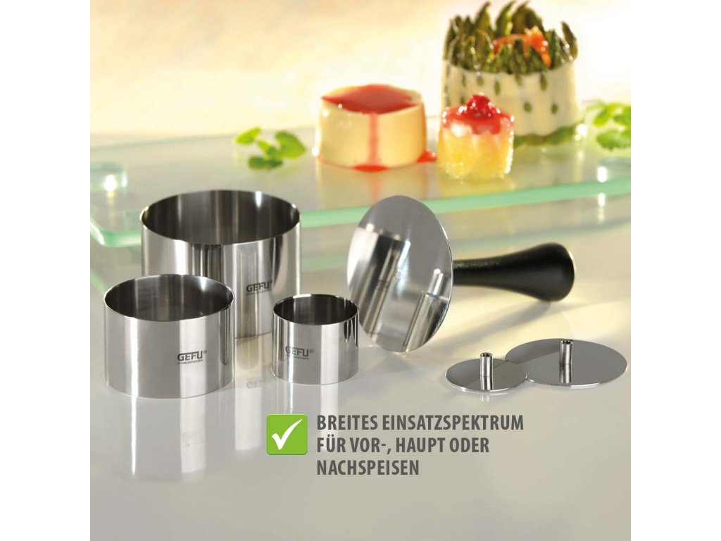 Sada potravinových kroužků FORMIDABLE od značky GEFU je nepostradatelným nástrojem pro moderní a kreativní servírování pokrmů. Tři různé velikosti kroužků umožňují univerzální použití – od jemných předkrmů přes hlavní chody až po dezerty.