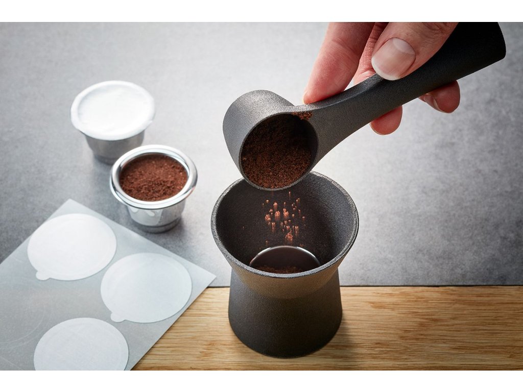 Použití je jednoduché: na prázdnou kapsli nasadíte trychtýř, naplníte ji kávou pomocí odměrky s tamperem, kapsli uzavřete a zalepíte aromatickou samolepkou, která zachová čerstvost a aroma. Po použití se samolepka odstraní, kapsle se vyčistí a je připravena k dalšímu použití.