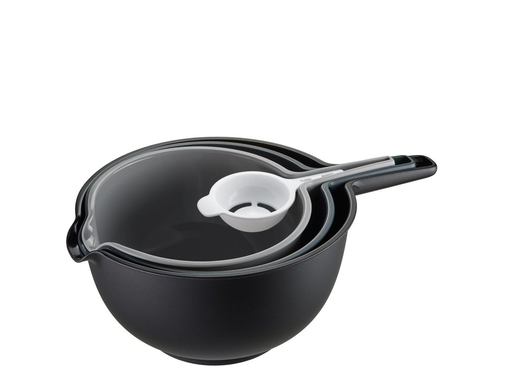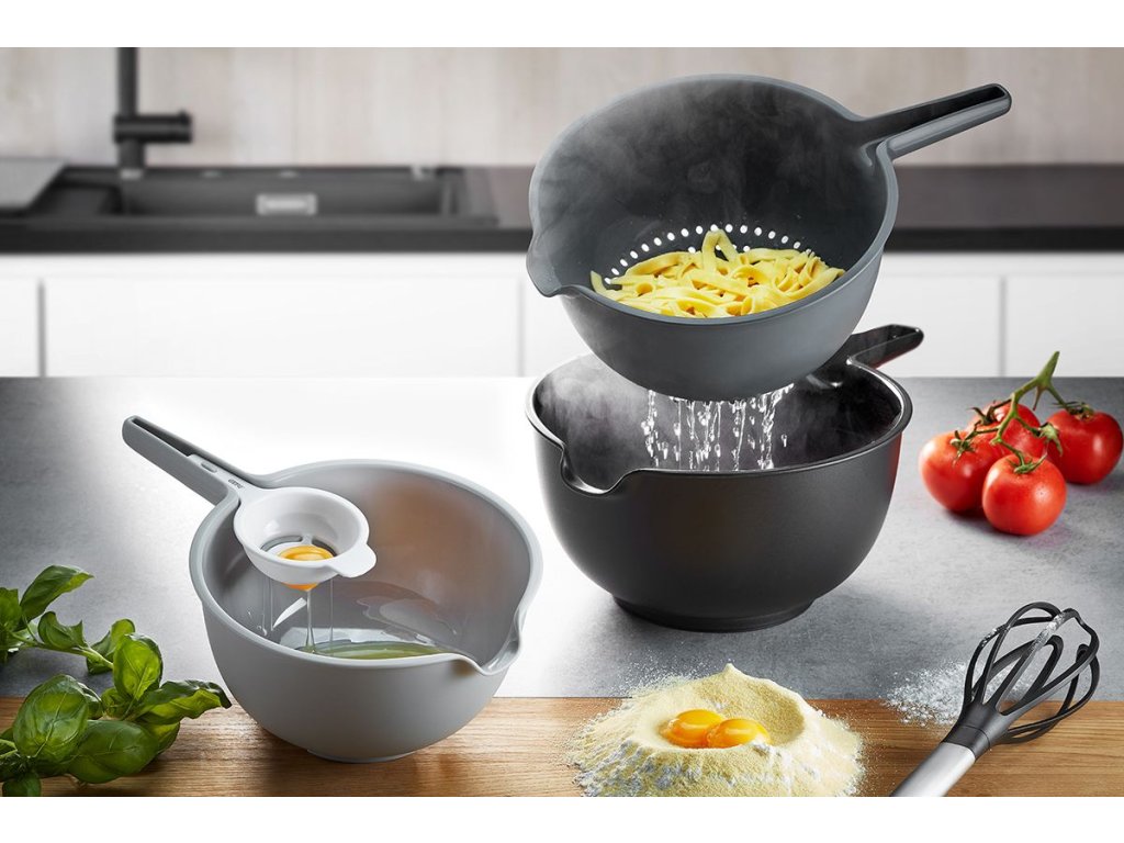 Sada je navržena pro všestranné použití při vaření a pečení. Obsahuje dvě mísy různých velikostí, cedník a oddělovač žloutků, který lze pohodlně uložit přímo na mísu. Větší mísa je vybavena protiskluzovými nožičkami pro stabilní práci, obě mísy mají praktické rukojeti a výlevky, které usnadňují manipulaci i přelévání.