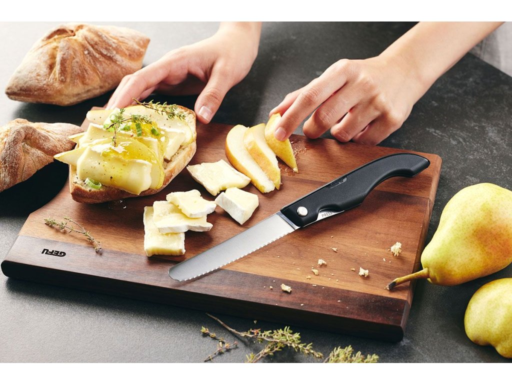 Nůž MOVE je navržen pro maximální flexibilitu při přípravě jídel v kuchyni, na pikniku i při cestování. Bez problémů si poradí s ovocem, zeleninou, snídaňovými sendviči, klobásami i drobnými svačinami. Praktický vlnitý střih zajišťuje čistý řez a univerzální použití.
