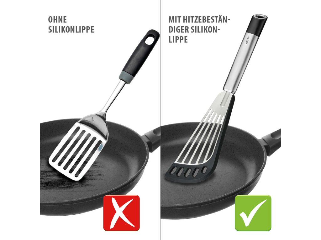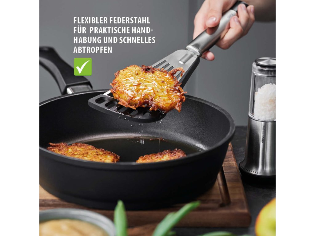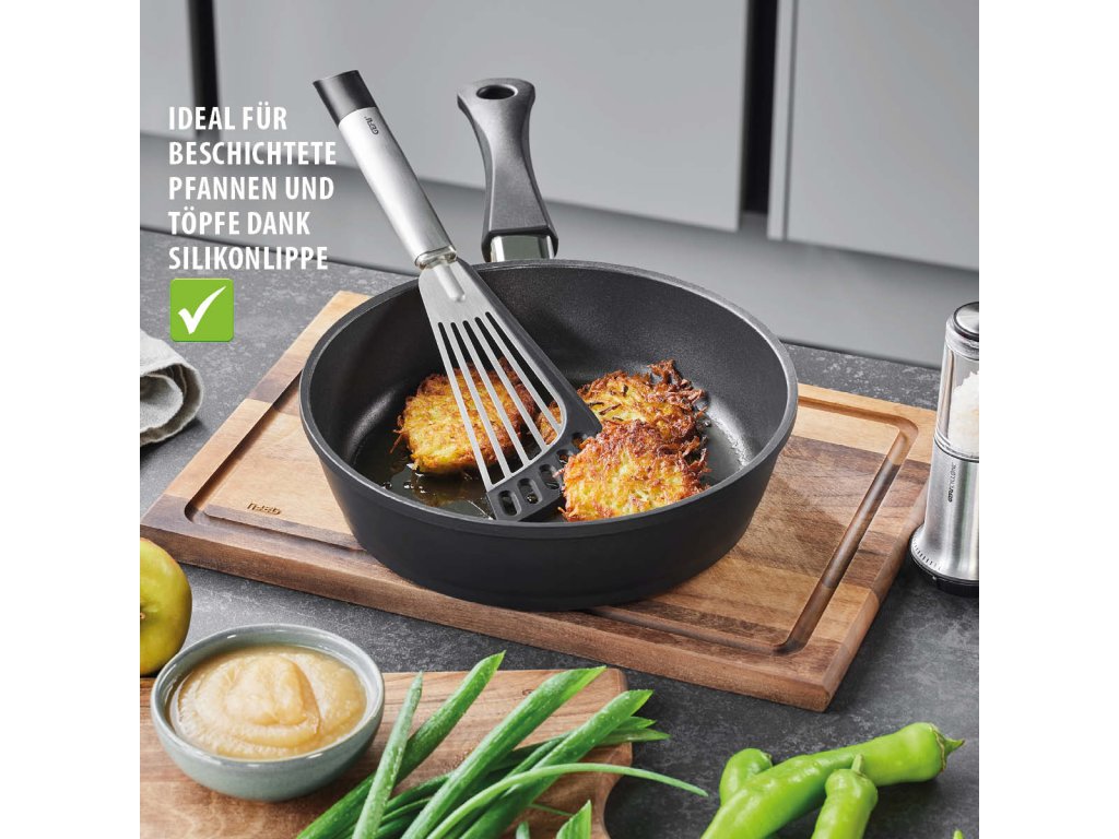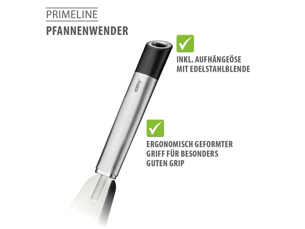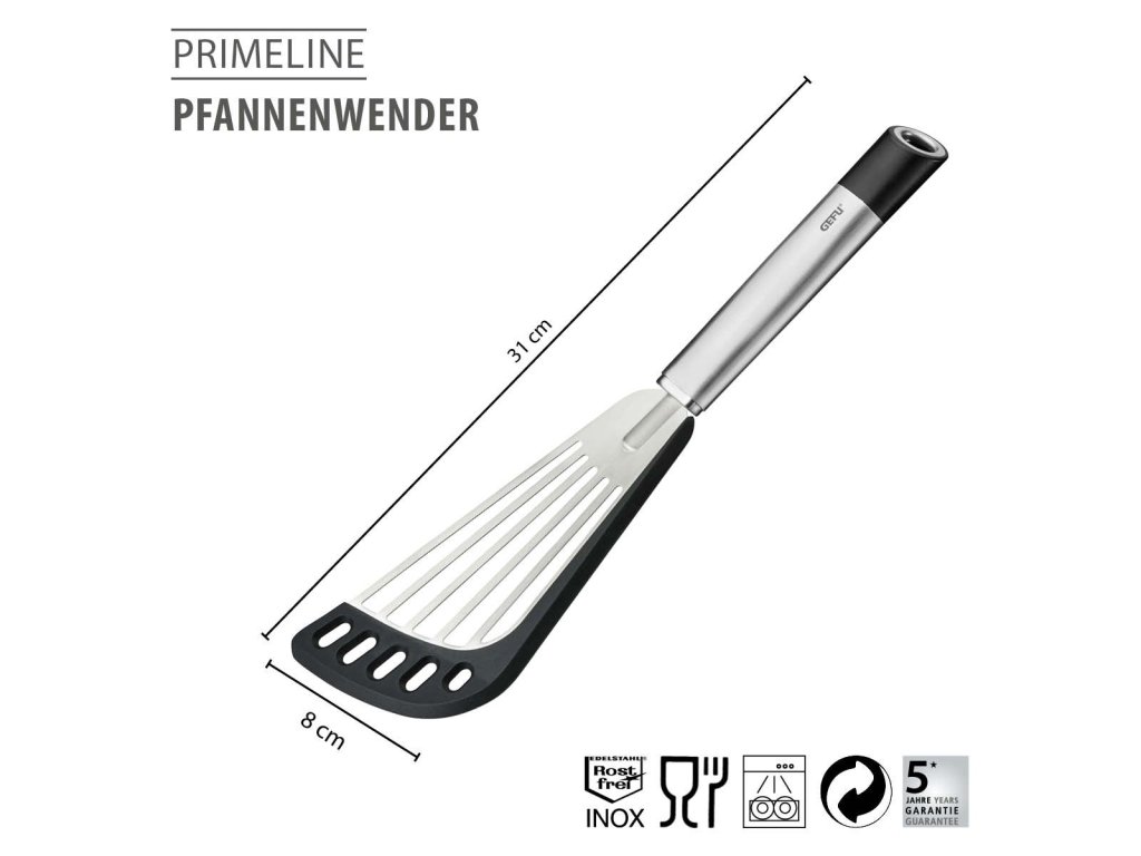 Špachtle PRIMELINE je navržena pro pohodlnou a bezpečnou manipulaci při vaření i smažení. Plochá otočná plocha s flexibilním, oboustranným silikonovým povrchem zabraňuje přichytávání jídla a chrání citlivé povrchy nádobí. Zakřivený tvar usnadňuje práci přímo v pánvích a hrncích a umožňuje snadné podebrání i otáčení pokrmů.