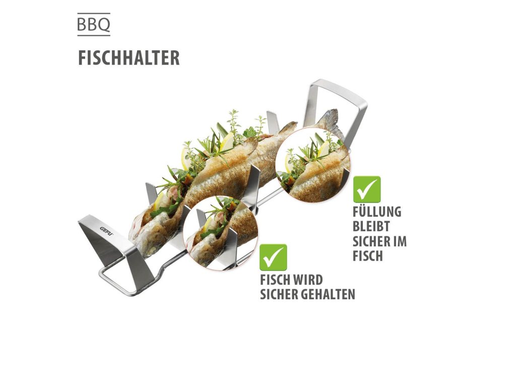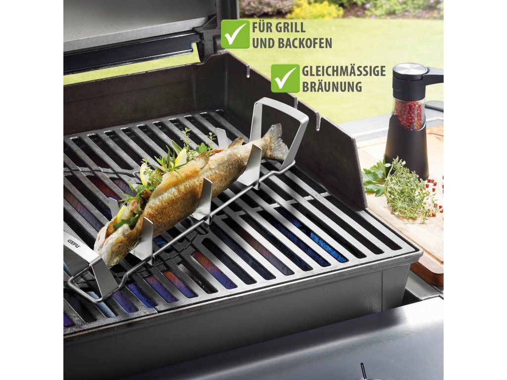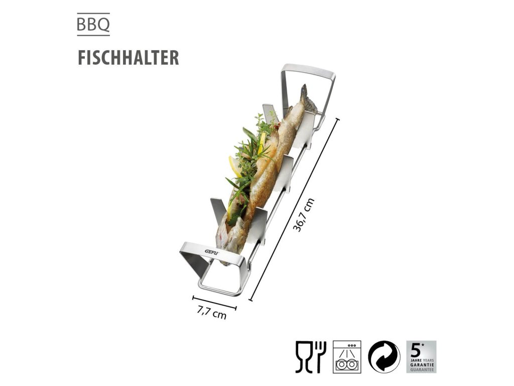 Držák je vhodný pro použití na grilu i v troubě. Vysoce kvalitní nerezová ocel zajišťuje odolnost, stabilitu a snadnou údržbu. Ryba zůstává během přípravy pevně uchycena, nepřichytává se a na stůl dorazí s krásně neporušenou kůží.