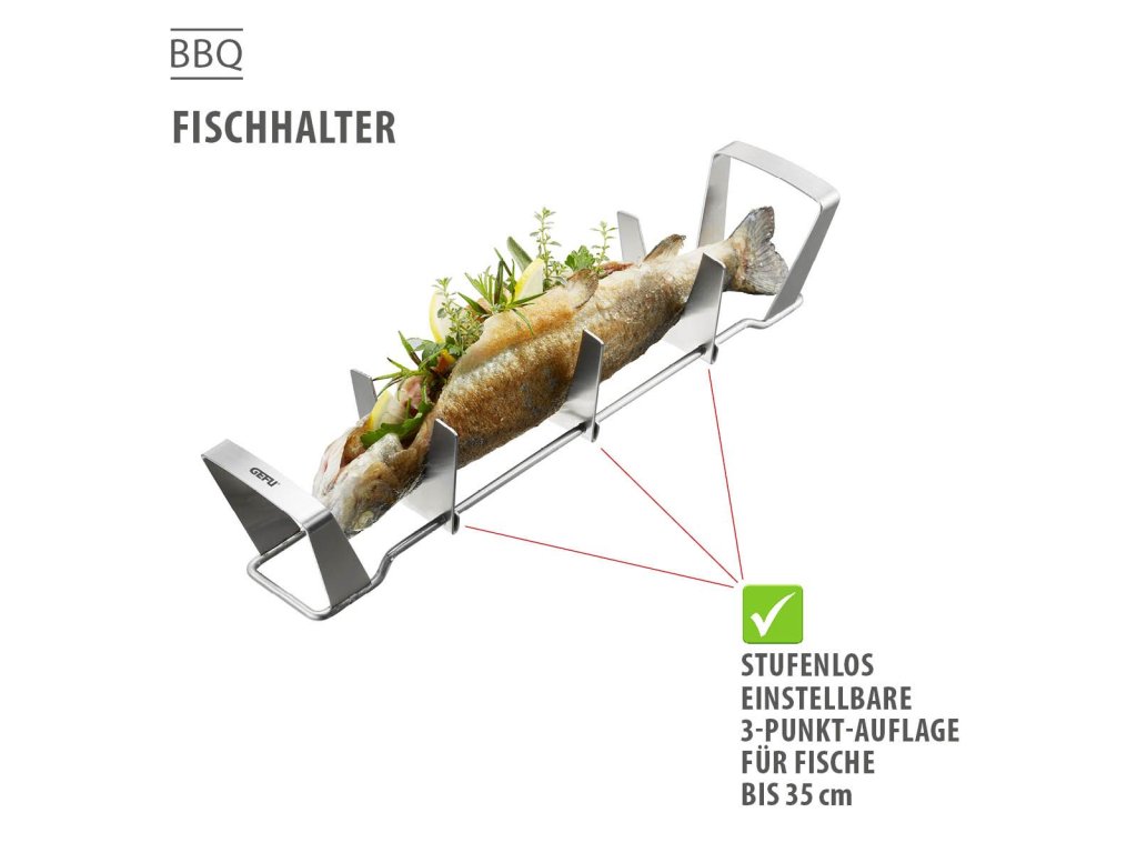 Tento praktický držák umožňuje snadnou a šetrnou přípravu ryb o délce až 35 cm. Díky plynule nastavitelné tříbodové opěře lze rybu přesně přizpůsobit velikosti i tvaru, ať už ji připravujete břichem dolů nebo hřbetem dolů, například plněnou bylinkami a citronem.