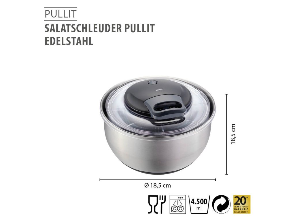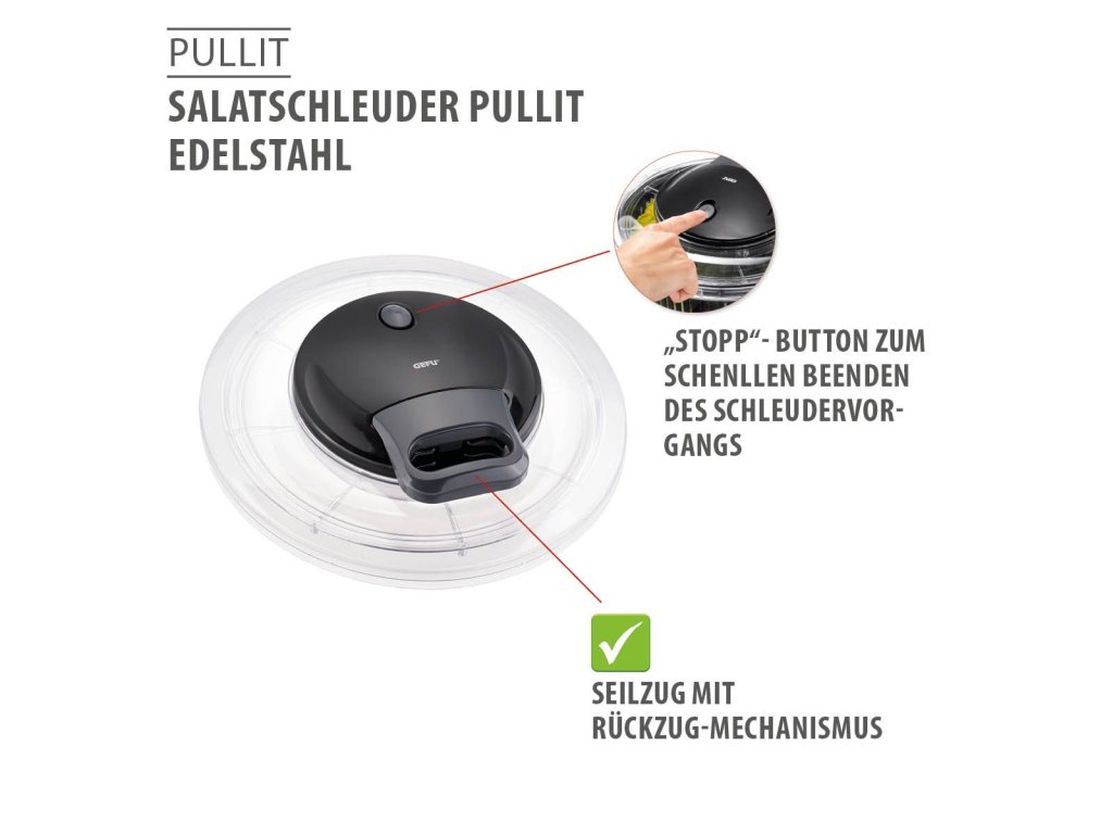 Sušič salátu PULLIT spojuje funkčnost s designem. Listové saláty jsou v této elegantní a exkluzivní salátové šlehačce se šňůrovým pohonem šetrně a rychle sušeny, aby mohly být krásně servírovány v nerezové míse.