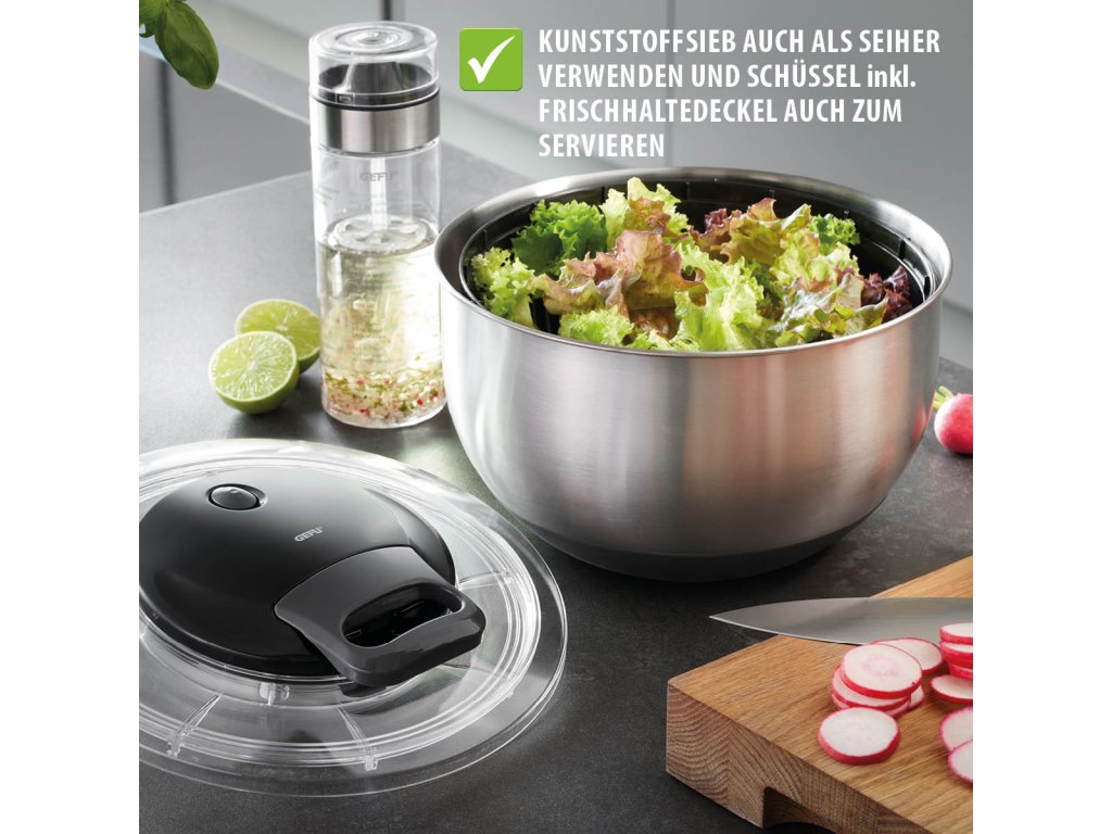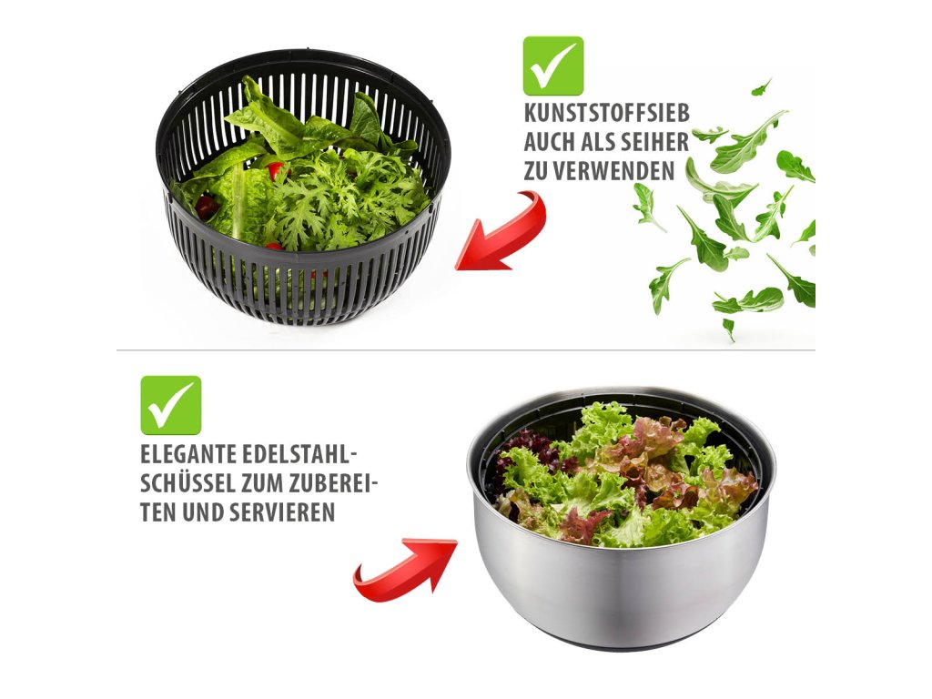 Sušte salát a elegantně ho servírujte – s salatschleuder PULLIT v atraktivním nerezovém designu je to snadné
