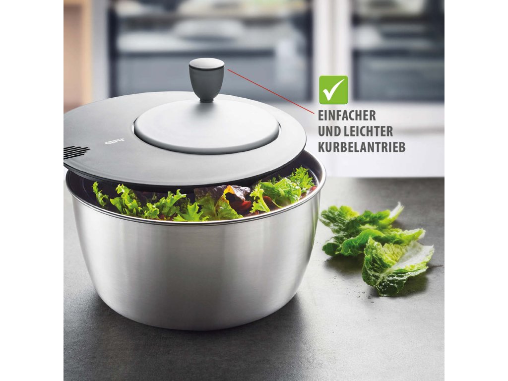 Omyté salátové listy jsou s pomocí pohodlného kličkového pohonu rychle a efektivně sušeny. Integrovaný výlevník umožňuje snadné vylití vody, což šetří čas a úsilí. Elegantní design dělá z mísy skvělý doplněk pro servírování na stole, a síto může být použito také jako cedník.