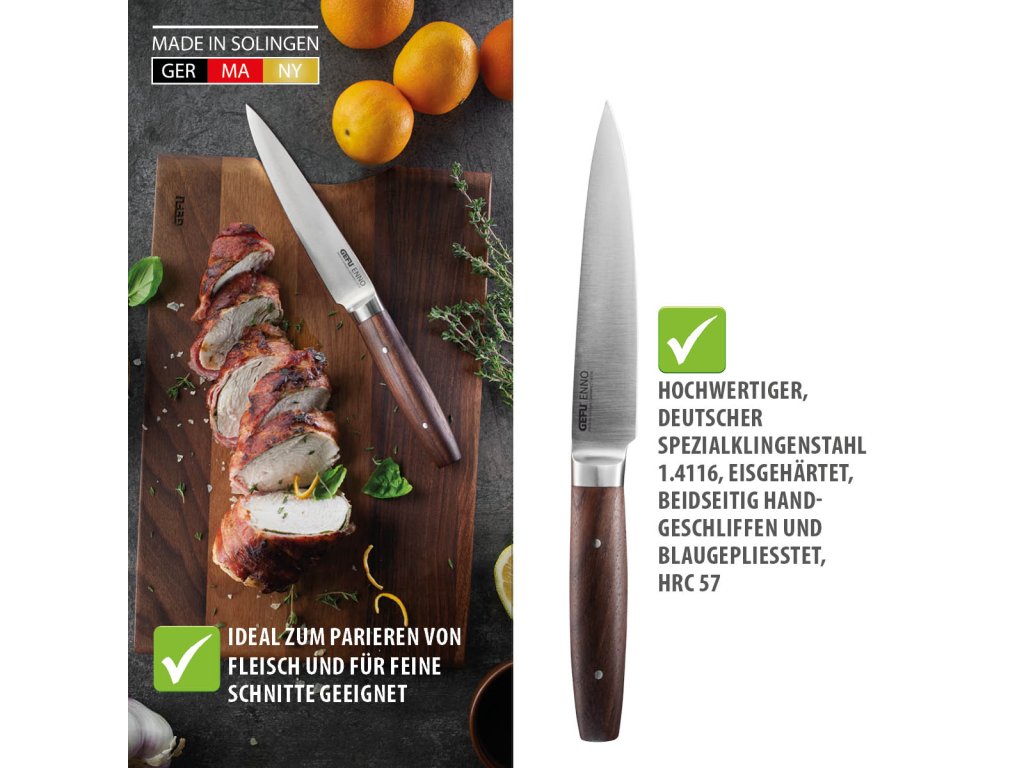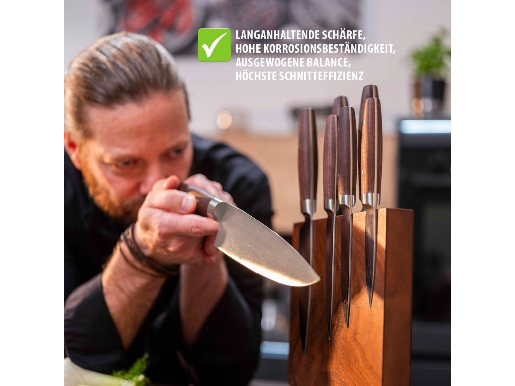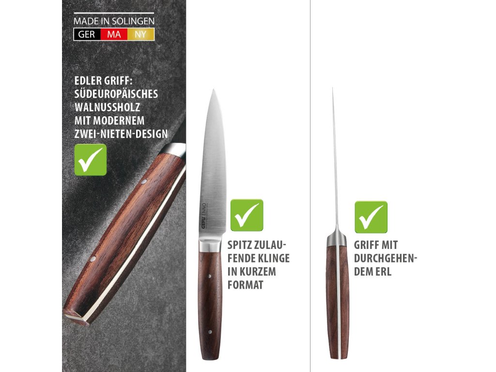 Čepel je vyrobena z vysoce kvalitní německé speciální oceli 1.4116 ze Solingenu, je kalená v ledu, ručně broušená z obou stran a modře leštěná, což zaručuje dlouhotrvající ostrost, vysokou odolnost proti korozi a tvrdost HRC 57. Ergonomicky tvarovaná rukojeť z jemného jihoevropského ořechového dřeva s plným upínacím cívkem a dvěma nýty bezpečně padne do ruky a podtrhuje elegantní, nadčasový design. Nůž je vyráběn v Solingenu v Německu a představuje spojení tradiční řemeslné výroby a moderních nároků na výkon.