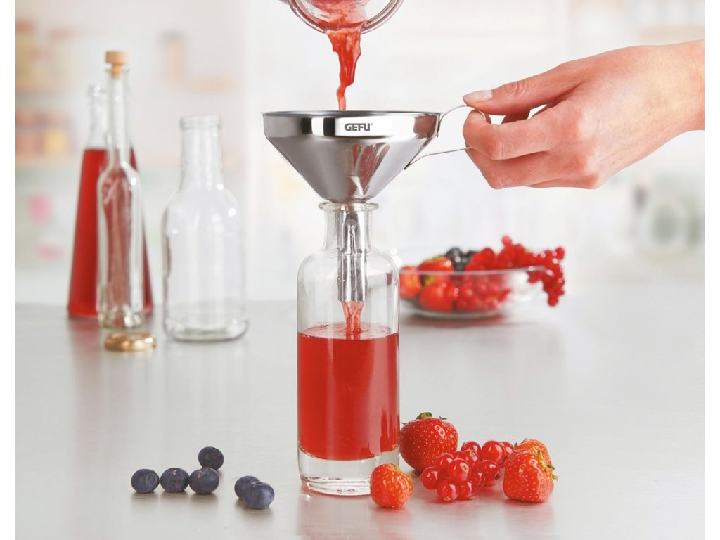 Malý, ale velmi praktický plnicí trychtýř VERSARE je nepostradatelným pomocníkem při domácím zpracování šťáv, sirupů nebo likérů. Umožňuje snadné a bezpečné přelévání přímo do lahví bez zbytečného úniku tekutin. Odnímatelné sítko zachytí semínka a zbytky ovoce, takže do lahve se dostane pouze čistá šťáva.