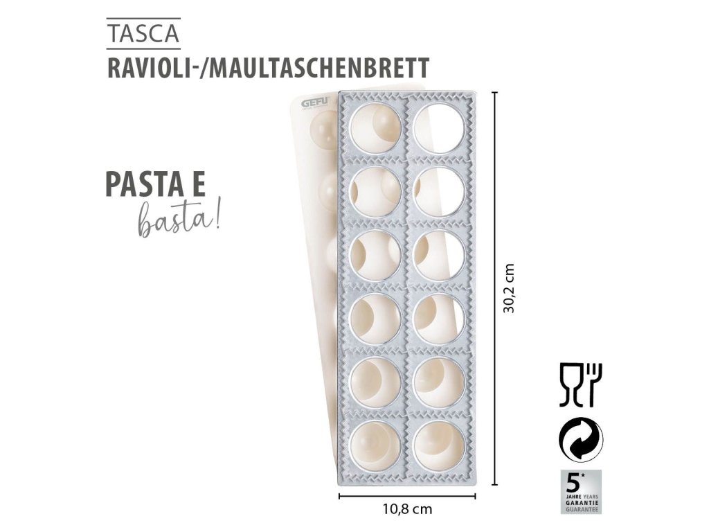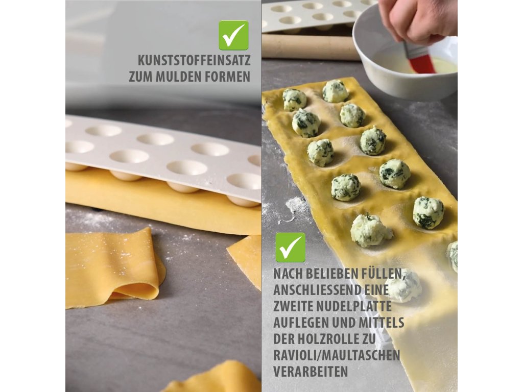 - 3-dílná sada: Obsahuje ravioli-/maultaschenbrett, plastový tvarovač a dřevěnou váleček.
