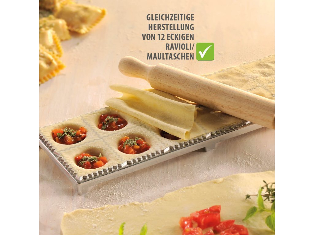 - Současná výroba: Umožňuje vytvoření 12 čtvercových ravioli nebo maultaschen najednou.