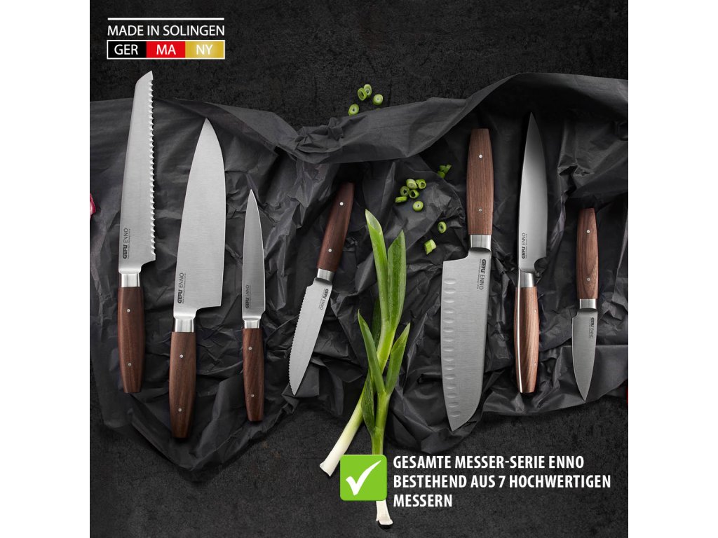 Čepel je vyrobena z vysoce kvalitní německé speciální oceli 1.4116 ze Solingenu, je kalená v ledu, ručně broušená z obou stran a modře leštěná. To zajišťuje dlouhotrvající ostrost, vysokou odolnost proti korozi a maximální řeznou účinnost při tvrdosti HRC 57. Ergonomická rukojeť z jemného jihoevropského ořechového dřeva s plným upínacím cívkem a dvěma nýty poskytuje bezpečný úchop, perfektní vyvážení a elegantní vzhled. Nůž je vyroben v Solingenu v Německu a splňuje nejvyšší nároky na kvalitu i funkčnost.