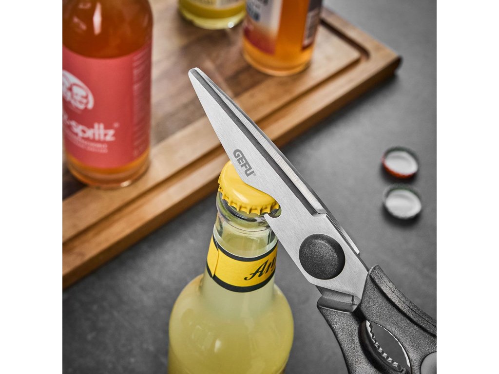 Univerzální nůžky UNA jsou vybaveny nerezovou čepelí a integrovaným otvírákem na lahve. Jsou také vhodné pro šroubovací uzávěry o průměru až 30 mm. Ergonomicky tvarovaná rukojeť z plastu zajišťuje pohodlné držení.