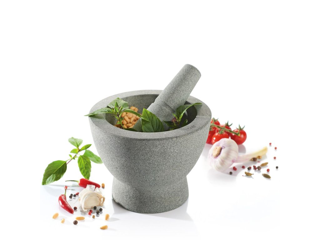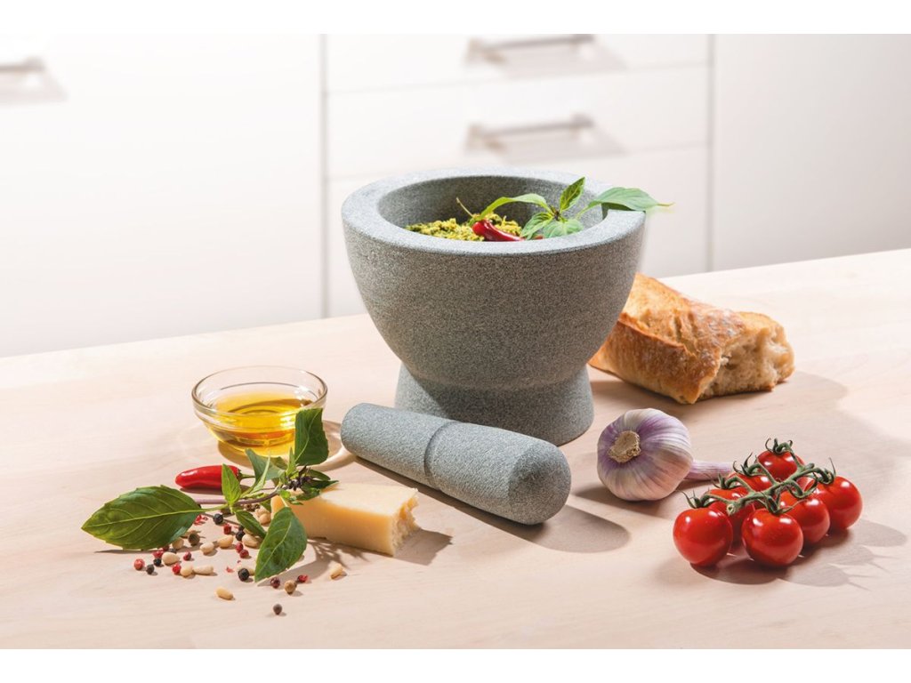 Tento velký granitový hmoždíř s granitovým tloučkem je ideální pro přípravu čerstvého pesta nebo bylinkových past. Zaoblené dno zajišťuje, že ingredience dosáhnou perfektní konzistence. Praktický dvojí užitek: Pokud hmoždíř otočíte, objeví se menší prohlubeň – ideální pro drcení například pepře.