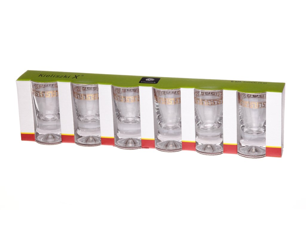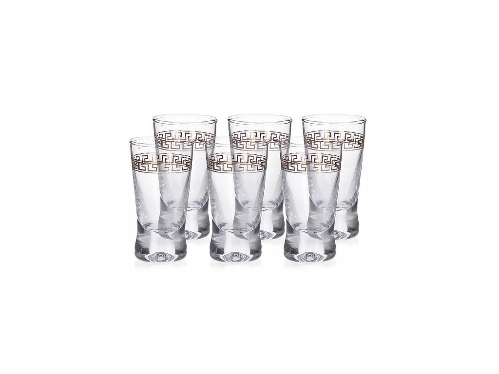 6dílná sada panáků na vodku klasického tvaru, panáky mají zdobení v podobě antického reliéfu. Sklenice má užší silné dno a směrem vzhůru se rozšiřuje. Objem 25 ml, výška 7 cm.