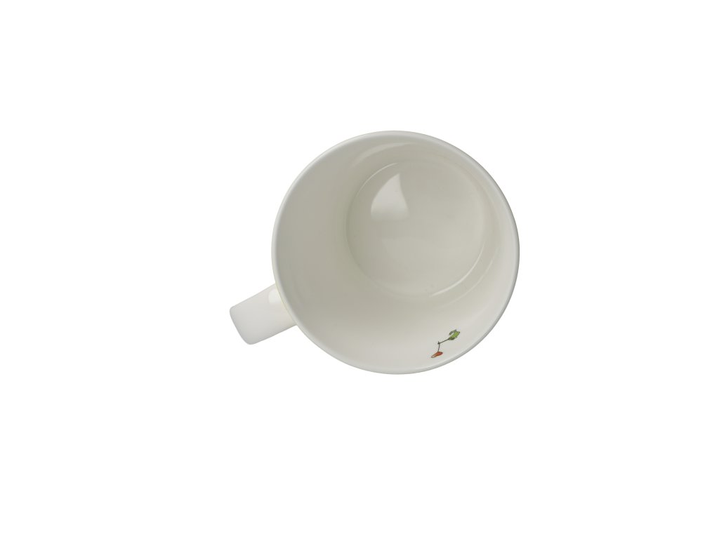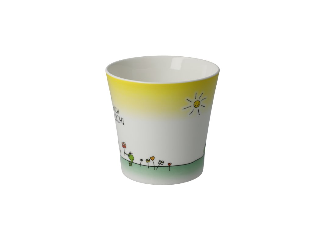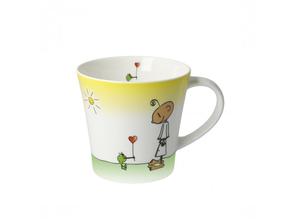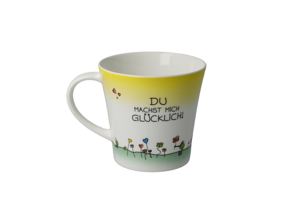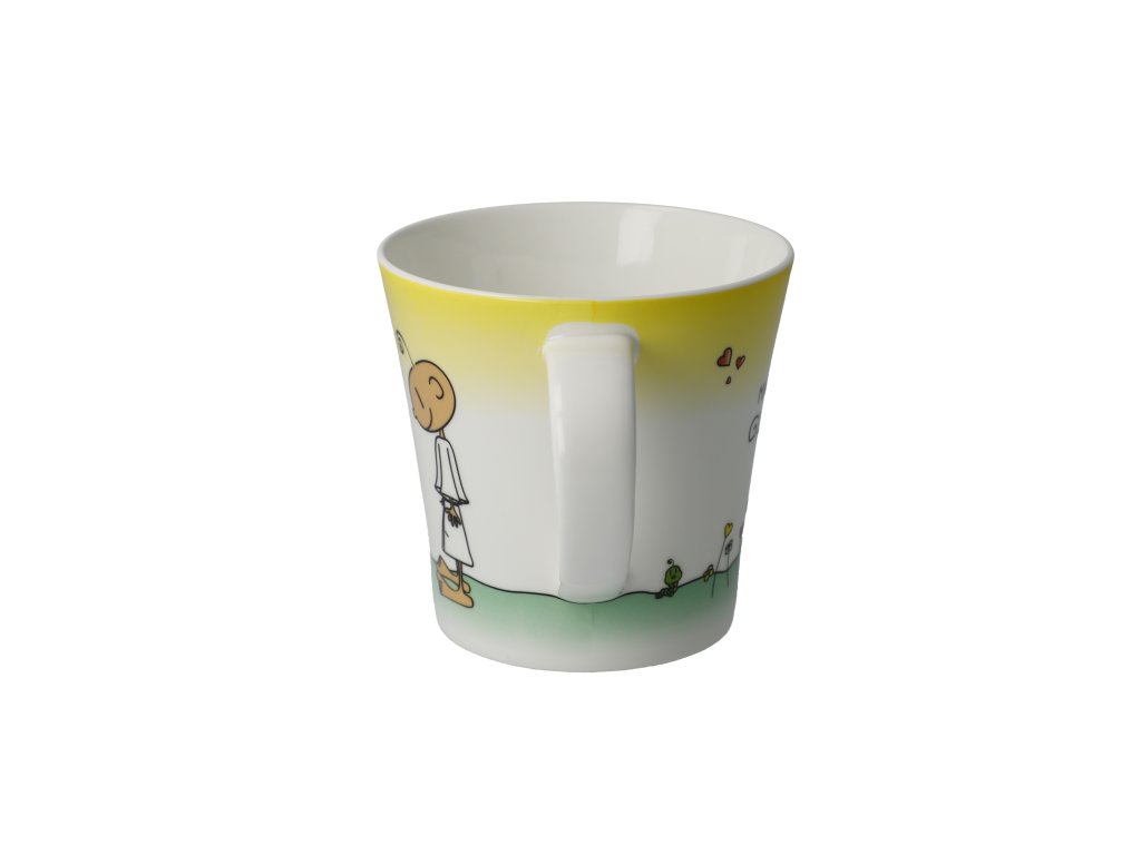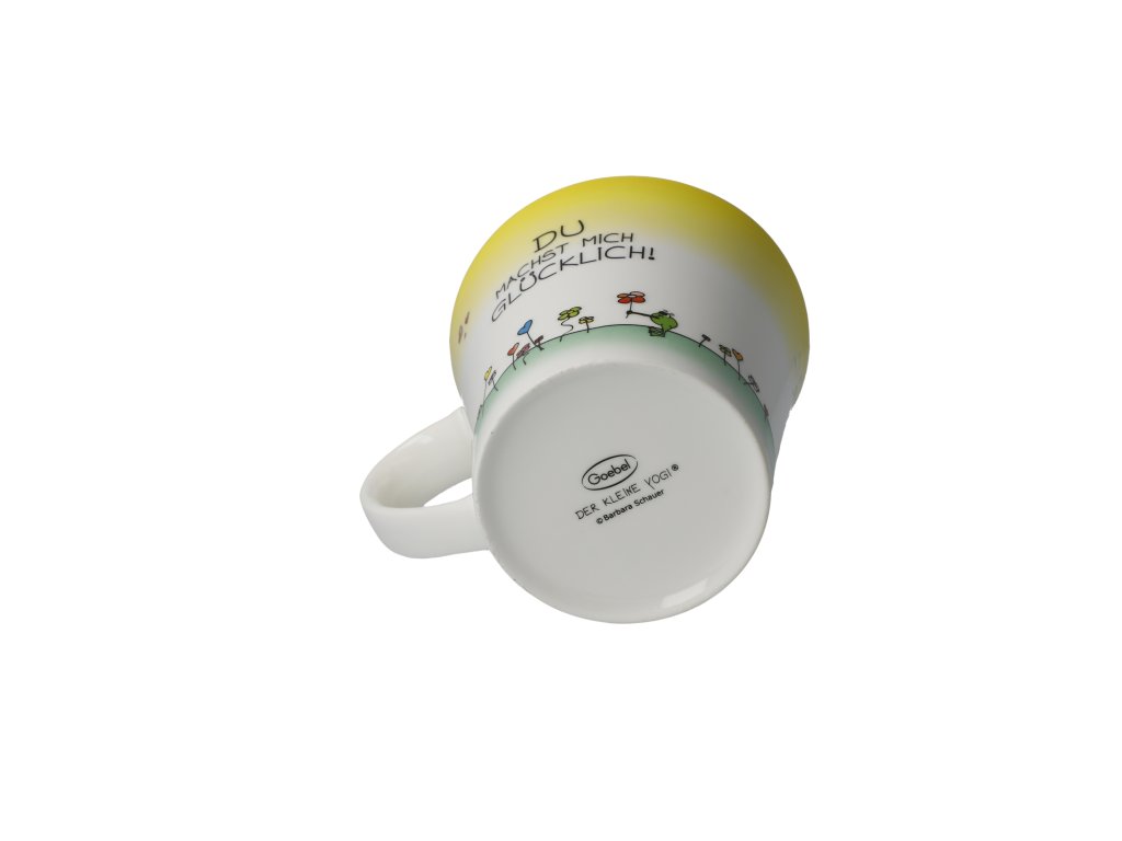 Hrnek z přední strany s ilustrací z cyklu "Der kleine Yogi®", zadní strana se zprávou "Du machst mich glücklich!" [Děláš mě šťastným].