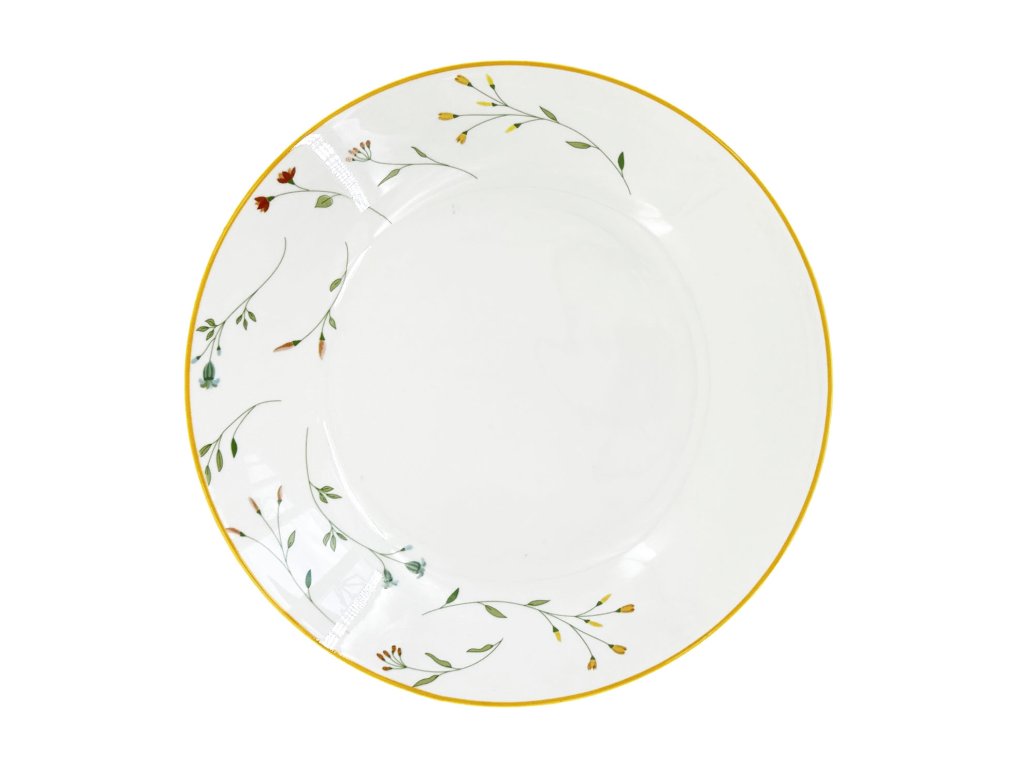 Design tohoto porcelánového hlubokého talíře je jedinečný. Luční květinový dekor je pečlivě soustředěn pouze na vnější okrajovou část, zatímco hluboké dno talíře zůstává čistě bílé. Tím je dosaženo kontrastu, který nechá plně vyniknout barvu a texturu servírovaného pokrmu. Celý botanický motiv je orámován jasným žlutým okrajovým lemem, který dodává porcelánu teplo a jas. Pro vytvoření hravého a slunečného setu lze talíř skvěle kombinovat s čistým porcelánem Linea Yellow (bílý porcelán se žlutou okrajovou linkou).