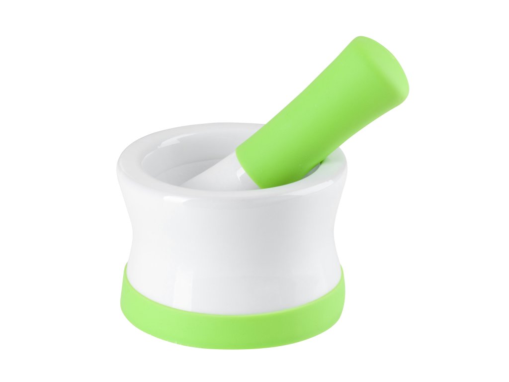 Porcelánový hmoždíř je oblečen do silikonové podložky, aby neklouzal po pracovní desce. Stejně tak rukojeť tloučku je opatřena silikonovým návlekem v zelené barvě pro lepší držení.