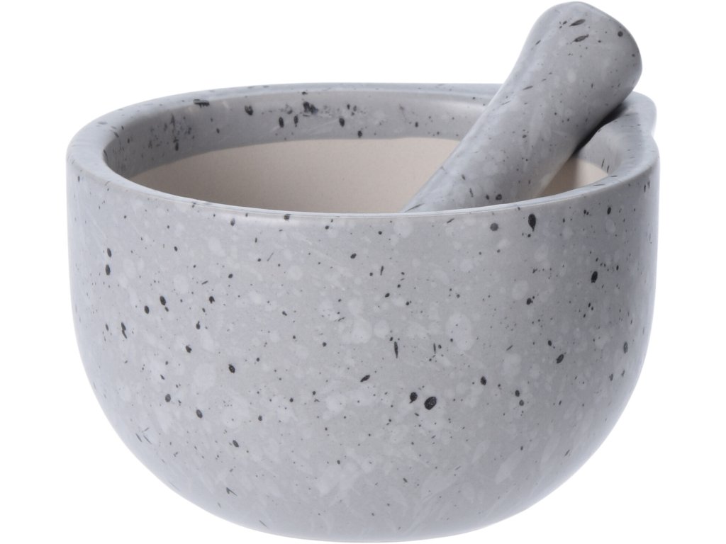 Světle šedý hmoždíř StoneLook nabízí ideální kombinaci elegantního designu a funkčního provedení. Vyrobený z kameniny a s objemem 330 ml je vhodný pro snadné drcení koření, bylinek či soli. Reaktivní glazura vytváří na každém kuse originální žulový efekt, díky čemuž se stává atraktivním doplňkem na kuchyňské lince.