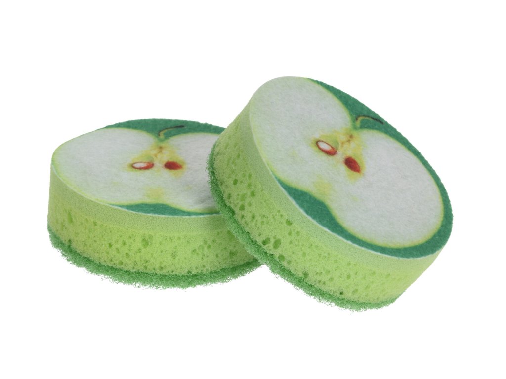 Kulatá houbička na nádobí s designem jablka. Z jedné strany měkká houba, z druhé pevnější vrstva pro jednoduché držení.
