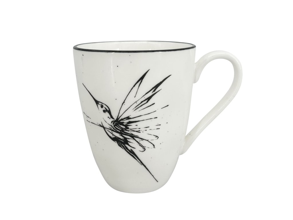 Na jedné straně hrnku najdete jemný motiv černého kolibříka, který symbolizuje krásu a lehkost, zatímco na druhé straně je decentní dekor černé trávy, dodávající harmonii s přírodou. Tento černobílý hrnek je nejen krásný na pohled, ale také praktický díky objemu 450 ml, který je ideální na čaj, kávu nebo jiné oblíbené nápoje.