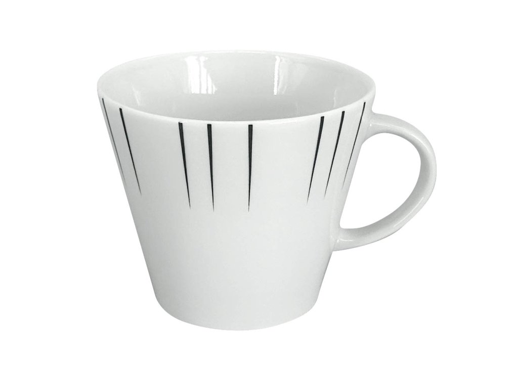 Hrnek je vyroben z bílého porcelánu a zdoben černým dekorem. Jednoduchý a stylový design šálku je doplněn o černé čáry, které vedou od horního lemu dolů do špičky, což šálku dodává moderní a sofistikovaný vzhled.