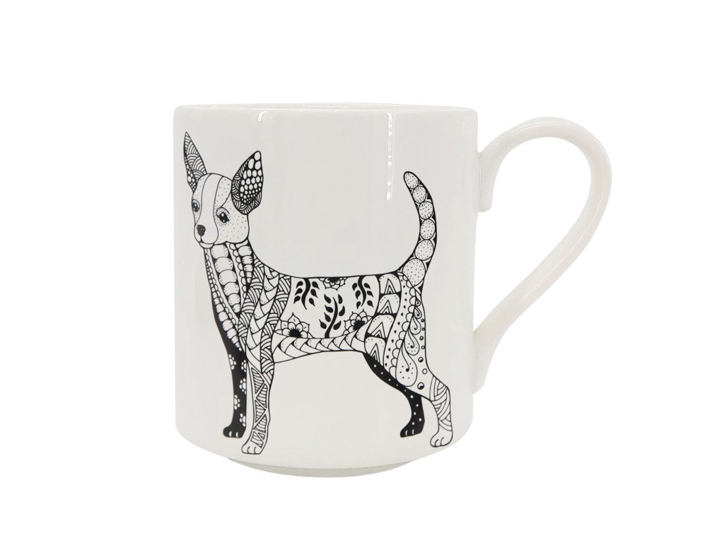 Hrnek je vyroben z kvalitního bílého porcelánu a zdobí ho výrazný černobílý motiv čivavy. Celý motiv je vyplněn dynamickou mozaikou patchworkových a zentangle vzorů, které odrážejí živý a hravý charakter plemene. Detailní kresba s velkýma ušima a ostražitým pohledem činí z tohoto hrnku nepřehlédnutelný bytový doplněk, ideální pro ranní espresso nebo silný čaj. Hledáte-li originální hrnek pro pejskaře, tento kousek dodá vaší snídani ten správný pepř.
