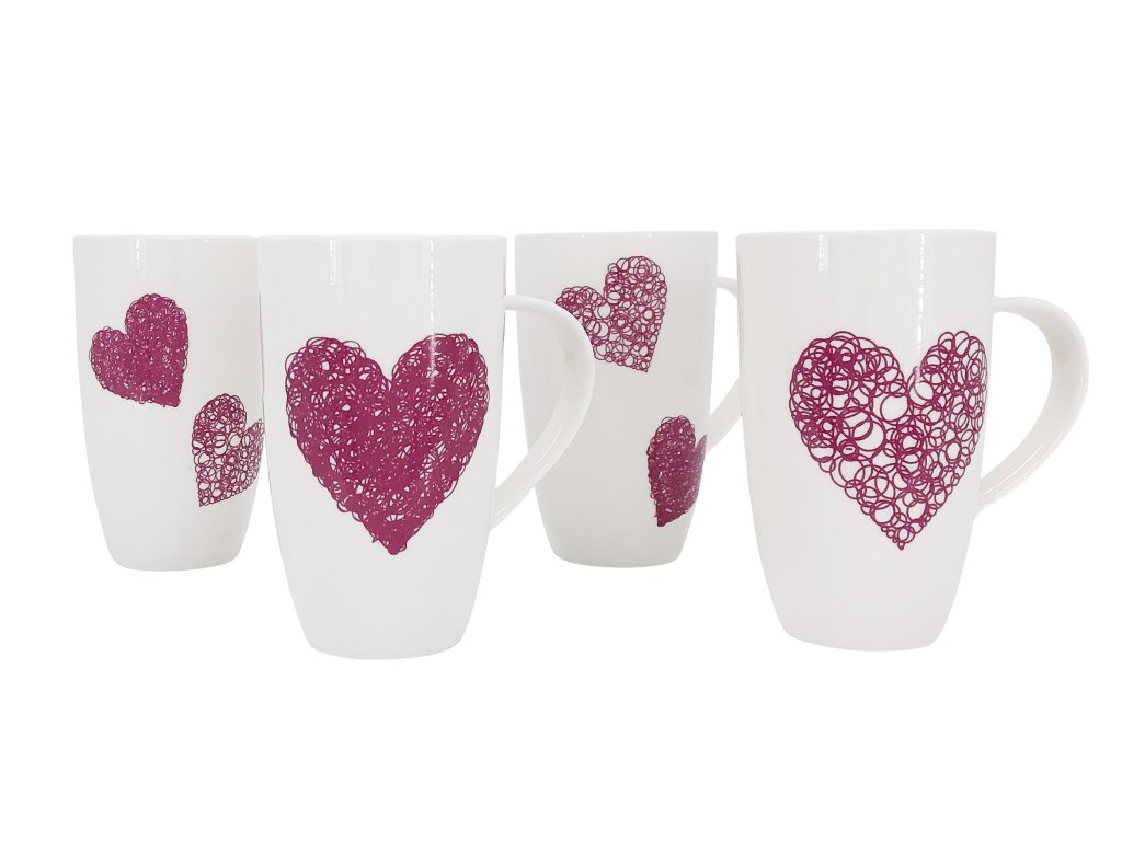 Kvalitní porcelán se smetanovým nádechem s dekorem růžového srdce. Dostupné ve čtyřech variantách.