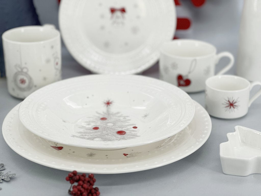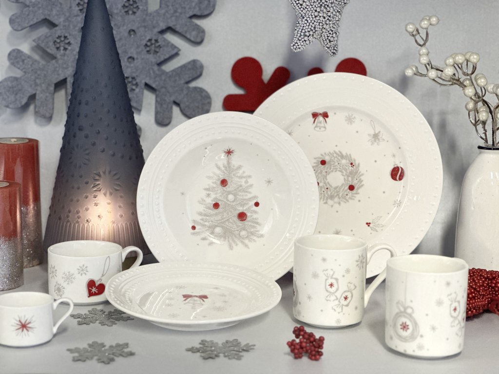 Bílý porcelán je základem této kolekce. Hrnky, misky a talíře jsou zdobeny vánočním dekorem v šedé a červené barvě, který přináší nádhernou vánoční atmosféru na váš stůl. Hrnky a šálky z této kolekce jsou ideální pro vaše oblíbené vánoční nápoje, jako je horká čokoláda nebo aromatický punč.
