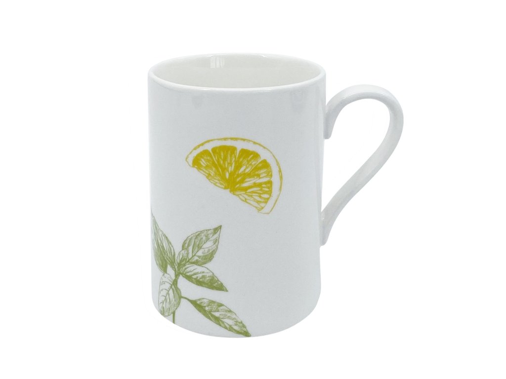 Kvalitní porcelán s nádechem smetanové barvy s dekorem čajových lístků a plátku pomeranče. Tvar válce hrnku zaručuje dobrou stabilitu a je příjemný do ruky.