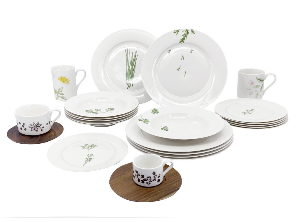 Moderní vaření je v dnešní době hlavně o využívání čerstvých potravin, především bylinek. Designéři české značky by inspire použili motiv čerstvých bylinek rovnou na porcelán. Jednoduché bílé kulaté talíře se svěží zelenou barvou. Hrnky na čaj a šálky na kávu pak tématicky ozdobili čajovými lístky, plátky pomeranče a rozsypanými kávovými zrny.