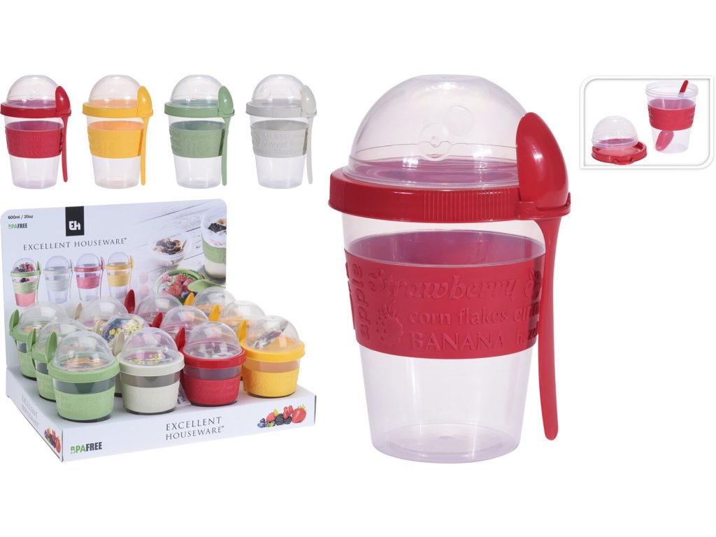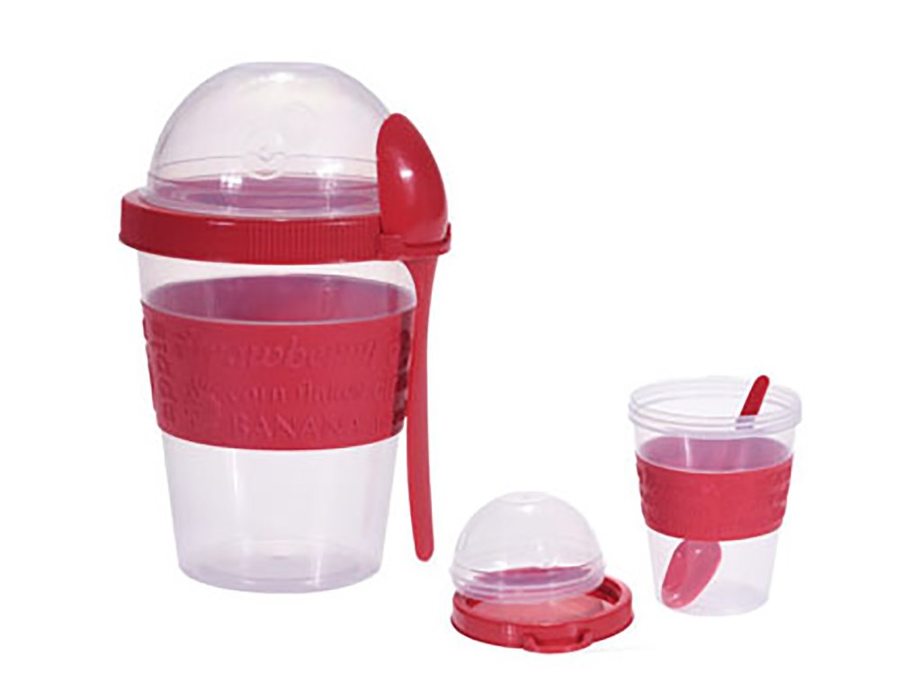 Praktický cestovní pohár na jogurt. Udělejte dětem do školy, sobě do práce nebo na výlet zdravou svačinku. Už nemusíte přemýšlet, jak to udělat, aby se vám müsli nerozmočily. Do poháru umístěte jogurt a do zásobníku ve víčku vložte svojí oblíbenou směs müsli, ořechů nebo lupínků.