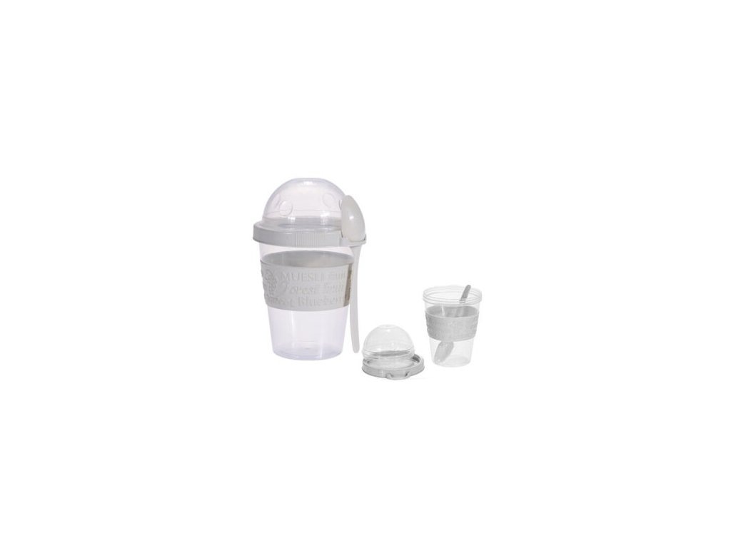Praktický cestovní pohár na jogurt. Udělejte dětem do školy, sobě do práce nebo na výlet zdravou svačinku. Už nemusíte přemýšlet, jak to udělat, aby se vám müsli nerozmočily. Do poháru umístěte jogurt a do zásobníku ve víčku vložte svojí oblíbenou směs müsli, ořechů nebo lupínků.