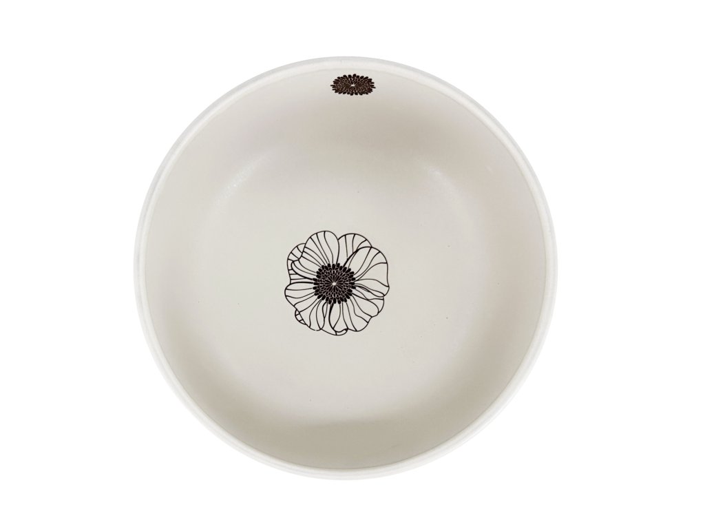 Miska je vyrobena z naší matné keramiky Clay a vyznačuje se smetanově bílým (krémovým) odstínem. Charakteristický je hnědý, kreslený motiv květu umístěný ve dnu misky a menší, opakující se dekor v horní části. Díky tomuto umístění motiv květu krásně vynikne, jakmile miska postupně získá prázdný prostor. Kolekce Clay se zaměřuje na přírodní vzhled a hřejivou keramiku, která je příjemná na dotek a přispívá k pohodové atmosféře.