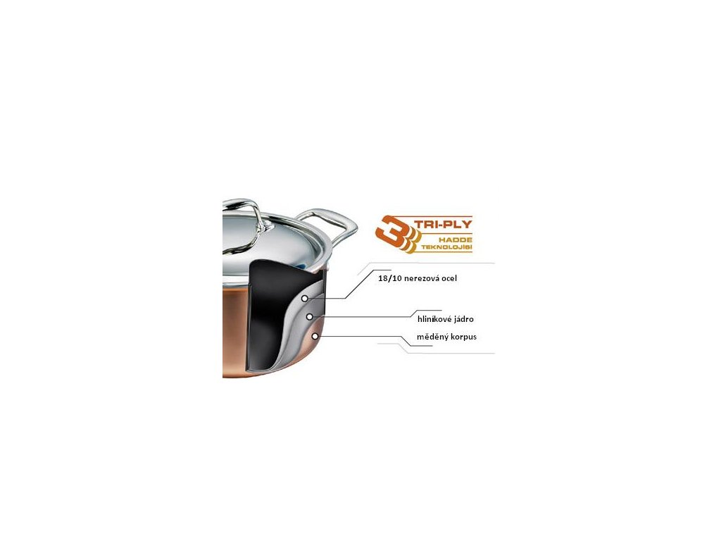 - měď, nejvodivější materiál, umožňuje kuchaři naprostou kontrolu nad teplotou hrnce