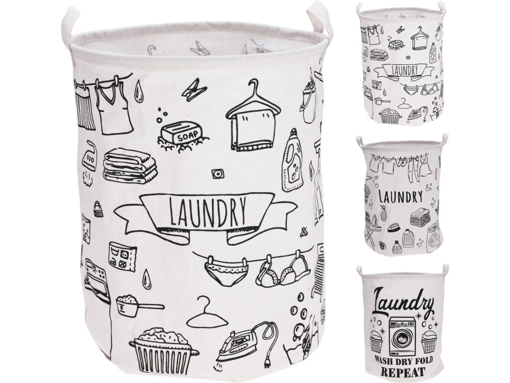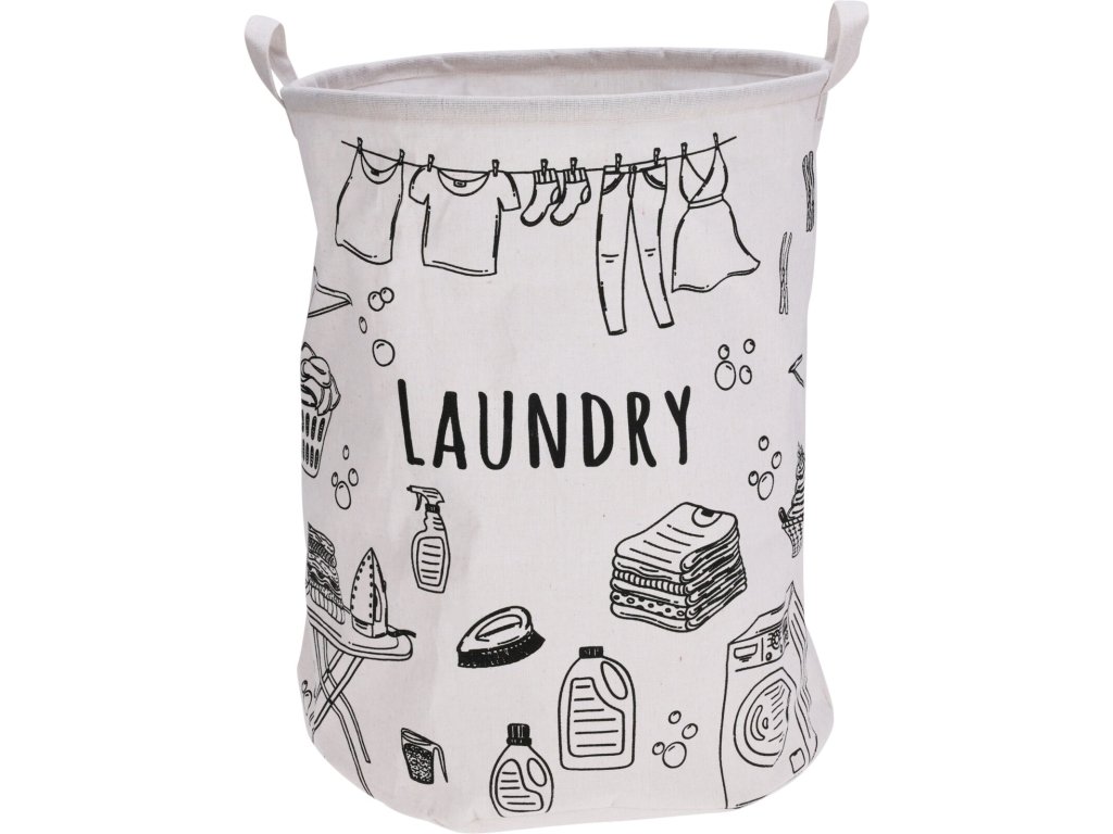 Plátěný koš na prádlo s originálním potiskem „Praní a kolíčky“ v černé barvě na bílém podkladu stylově oživí každou koupelnu nebo prádelnu. Kulatý tvar s průměrem 40 cm a výškou 50 cm poskytuje dostatek místa pro každodenní prádlo, ať už dětské nebo rodinné.