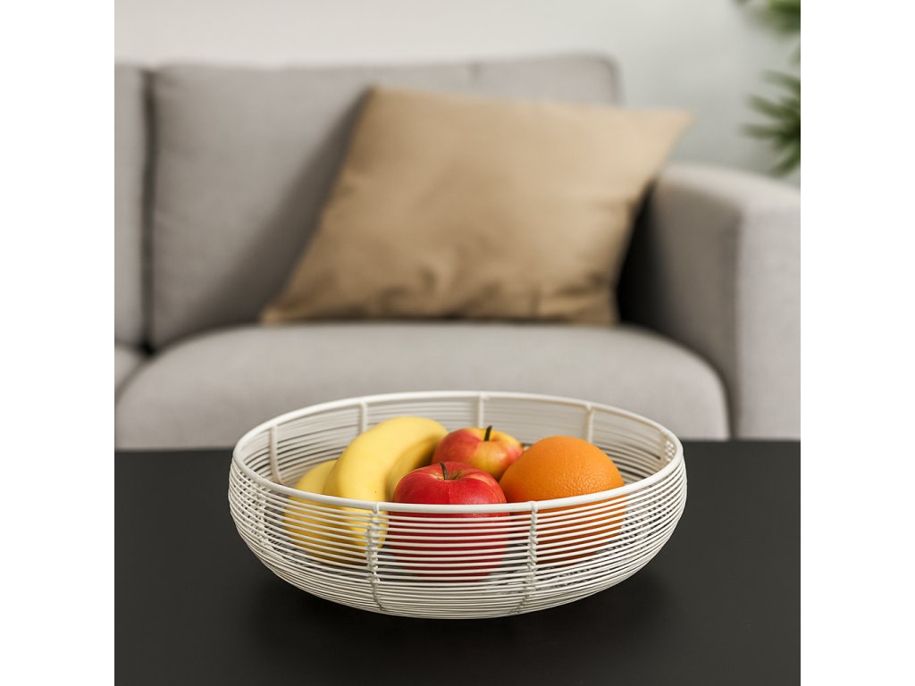 Košík Elva Ø 31 cm – kulatý drátěný košík v bílé barvě je stylovým a praktickým doplňkem do každé moderní i rustikální domácnosti. Jeho minimalistický kovový design s jemným drátěným pletením zajišťuje dobrou cirkulaci vzduchu, což je ideální například pro skladování ovoce, pečiva nebo dekorativních předmětů.