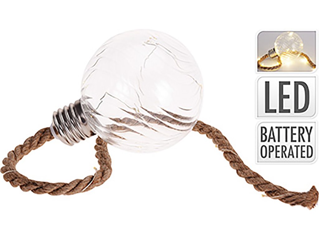 Svítící vánoční skleněné ozdoba na stromeček, ale i jako samostatná dekorace. Opatřena silným jutovým provazem, který slouží k zavěšení a zároveň je to krásný dekorativní prvek. Díky LED žárovičkám uvnitř rozzáří teplým světlem Vaše vánoce.
