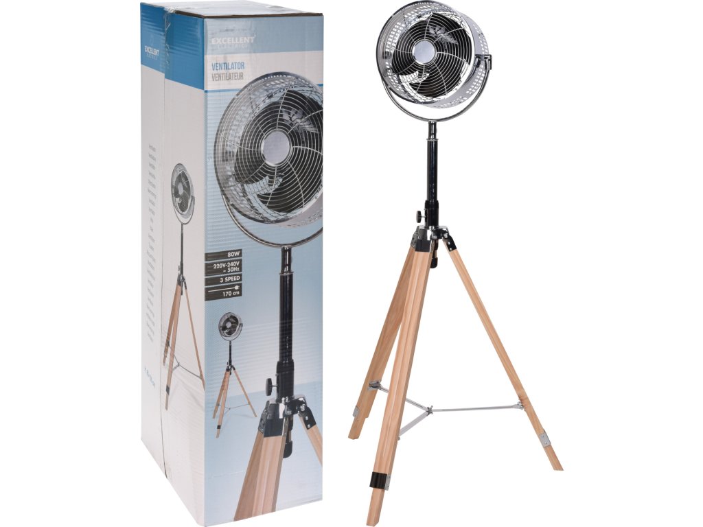 Konstrukce a materiál: Ventilátor má kovovou konstrukci s dřevěnými trojnožkami, které dodávají ventilátoru eleganci a stabilitu. Černá barva kovového těla spolu s dřevěnými trojnožkami vytváří moderní a stylový vzhled.