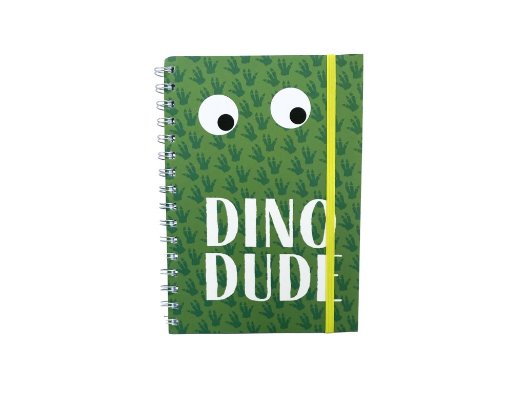 Linkovaný blok A5 v kroužkové vazbě. Pevné desky s gumičkou a motivem dinosaura.