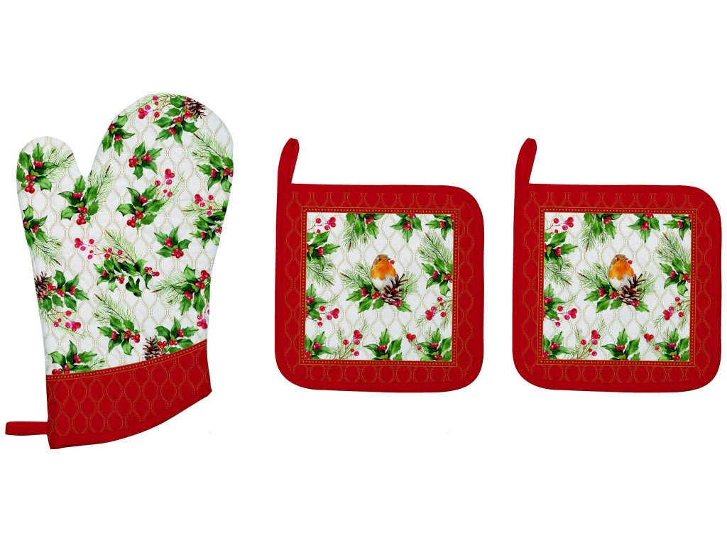 Elegantní kuchyňská rukavice a chňapky skvěle doplní vaši kuchyň a přinesou vám radost při přípravě, vaření a podávání jídla. Sada Christmas Berries obsahuje půvabnou kuchyňskou rukavici a dvě chňapky s vánočním motivem, s praktickým poutkem pro snadné zavěšení. Vyrobeno ze 100% bavlny a lze prát v pračce na 40 °C.
