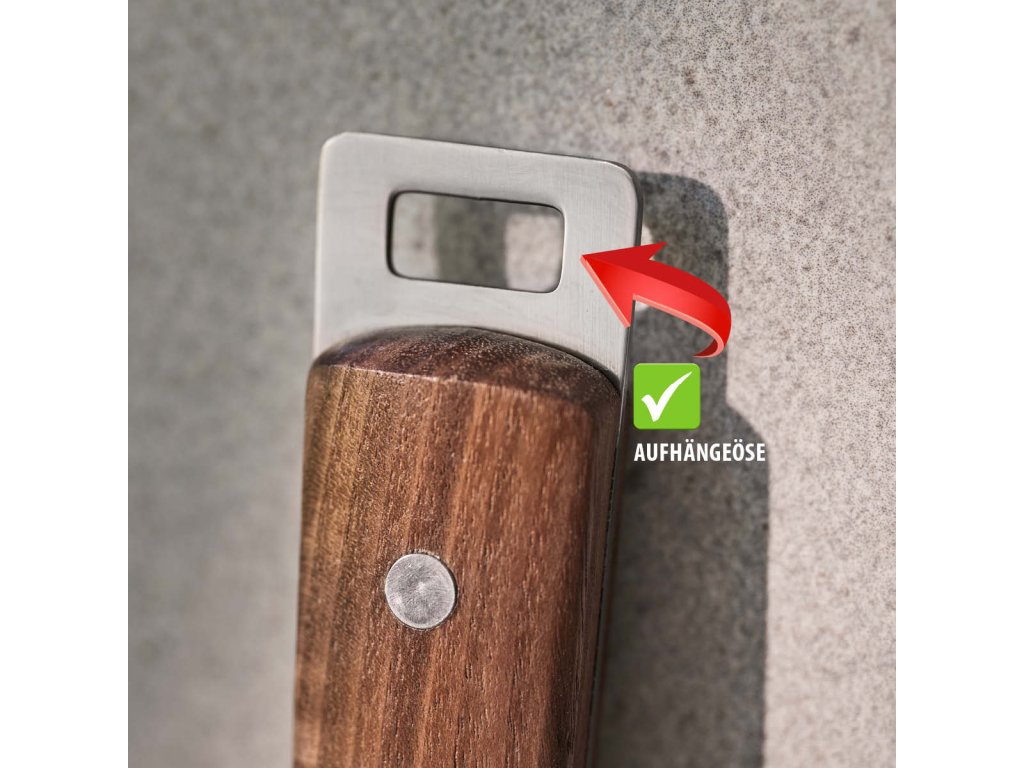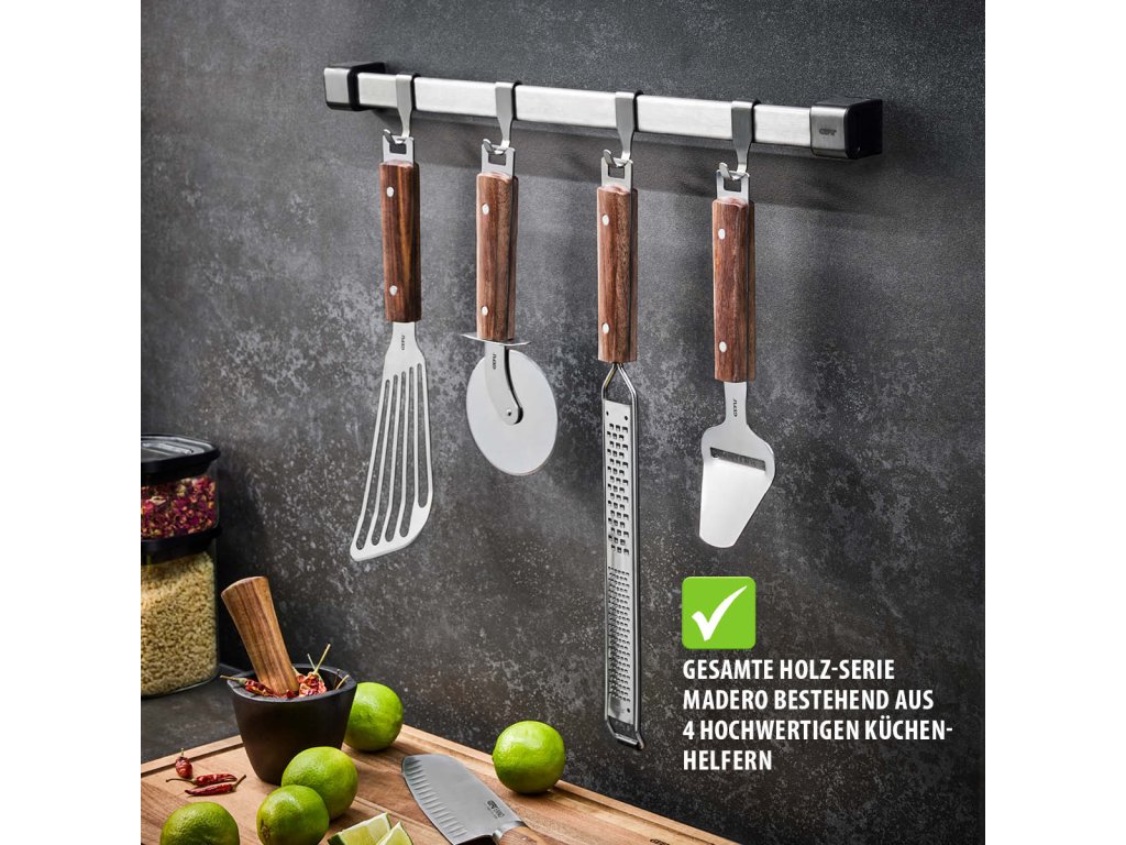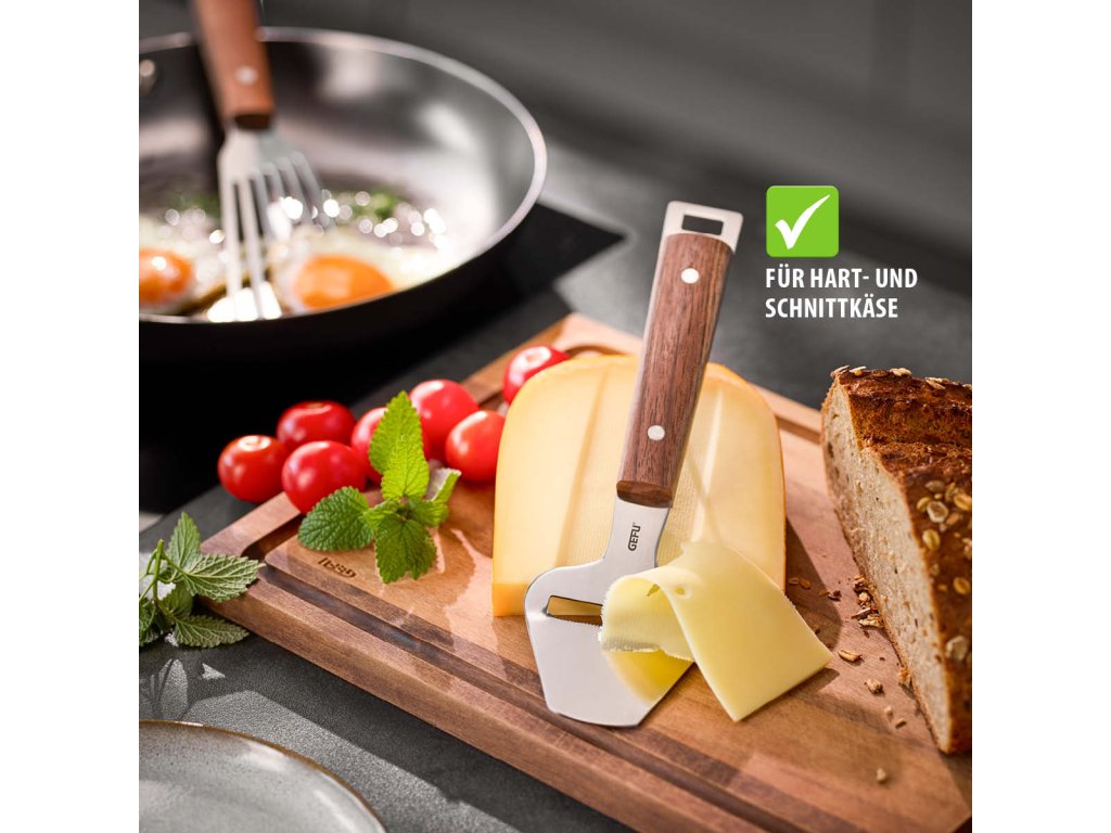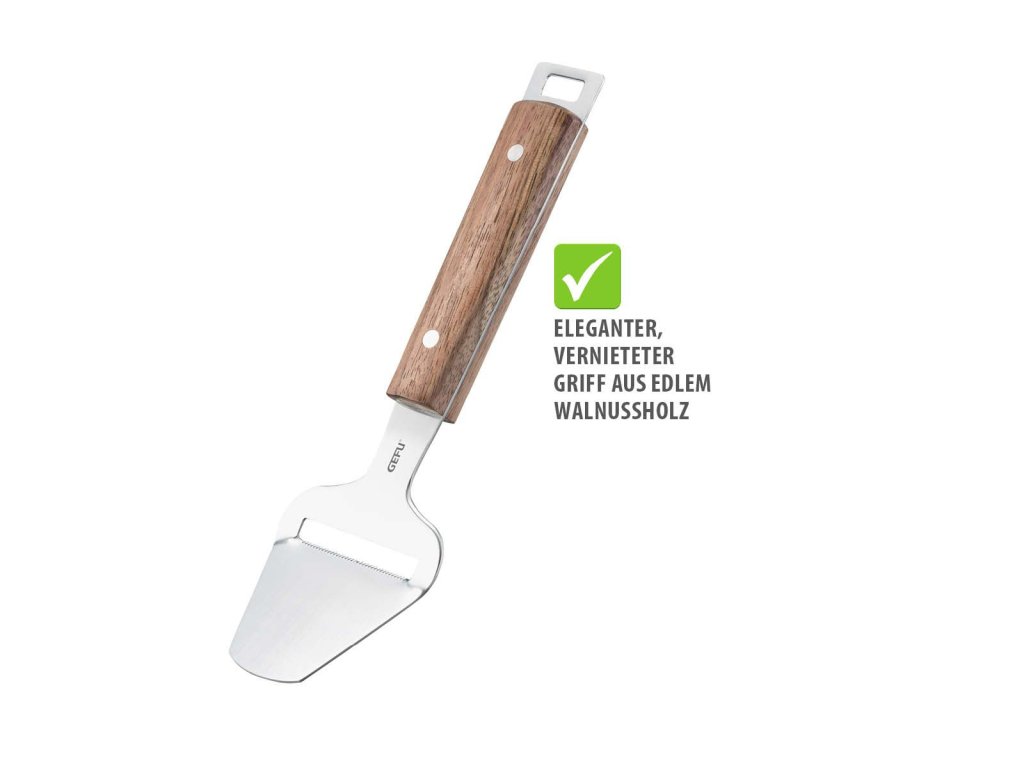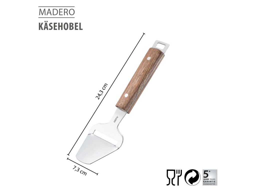 Rukojeť z jemného ořechového dřeva je ergonomicky tvarovaná, příjemná do ruky a dodává nástroji přirozenou eleganci. Díky závěsnému očku lze kráječ snadno uložit a mít jej vždy po ruce. Kráječ sýrů MADERO je nejen praktickým pomocníkem, ale i stylovým doplňkem každé kuchyně.