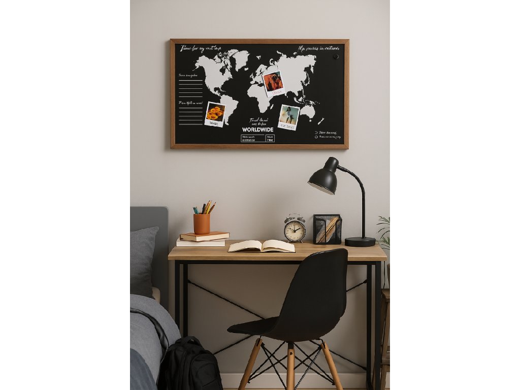 Součástí balení jsou 4 magnety s cestovatelskými fotografiemi, které lze snadno přemisťovat a použít pro připnutí vlastních poznámek, vstupenek či plánů. Díky kovovému háčku na zadní straně se tabule snadno zavěsí na zeď. Tabule podporuje kreativitu a plánování cest – ideální jako dárek pro cestovatele, teenagery i rodiny s dětmi.