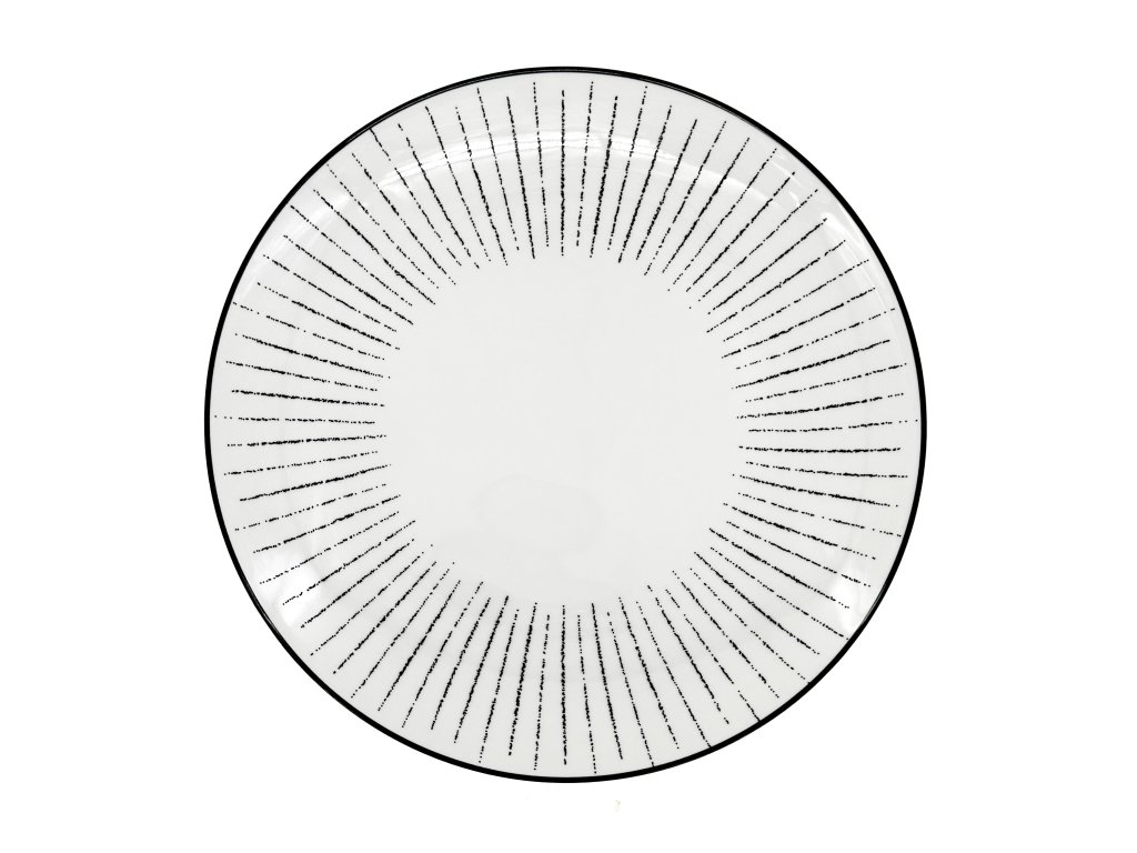 Dominantou talíře je unikátní grafický dekor tvořený paprsky přerušovaných čar (tzv. "dash"), které se elegantně rozbíhají od středu talíře k okraji. Tento moderní vzor vytváří optický klam pohybu a dodává prostírání nečekanou energii. Kontrastní černý okraj pak vizuálně rámuje talíř a dokonale propojuje design s celou řadou Linea Dash. Pokud vás zajímá minimalistický porcelán s grafickým vzorem, je to přesně to, co hledáte. Perfektně doplní jak skandinávský, tak industriální styl bydlení.