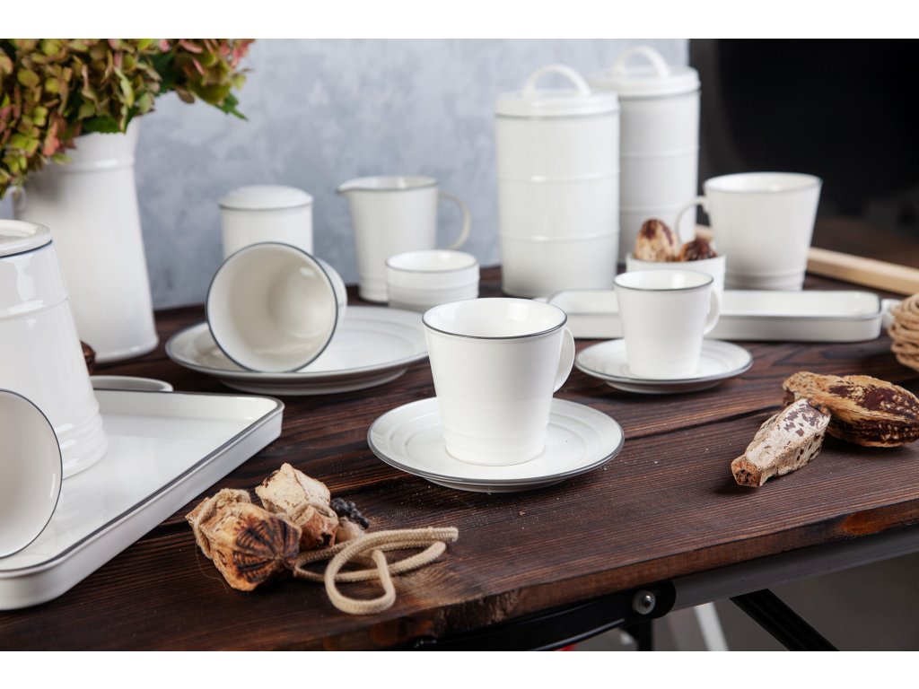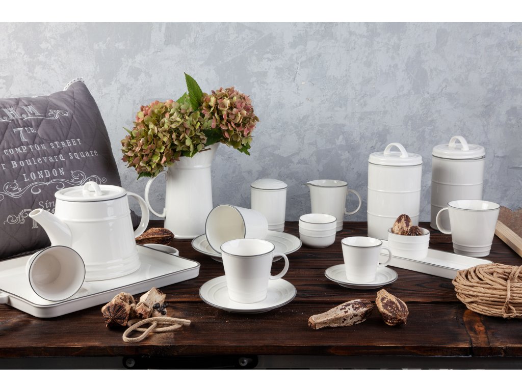 Design, který si pohrává s netradiční kombinací tvaru a materiálu. Tvar tak typický pro smaltované nádobí našich babiček a použitý materiál jakostní porcelán, působí mile a vlídně. Porcelánové talíře mají smetanový nádech a elegantní šedý proužek jen podtrhuje kontrast křehkosti a retro tvaru „kovového“ nádobí. Designové talíře v nadčasovém provedení.