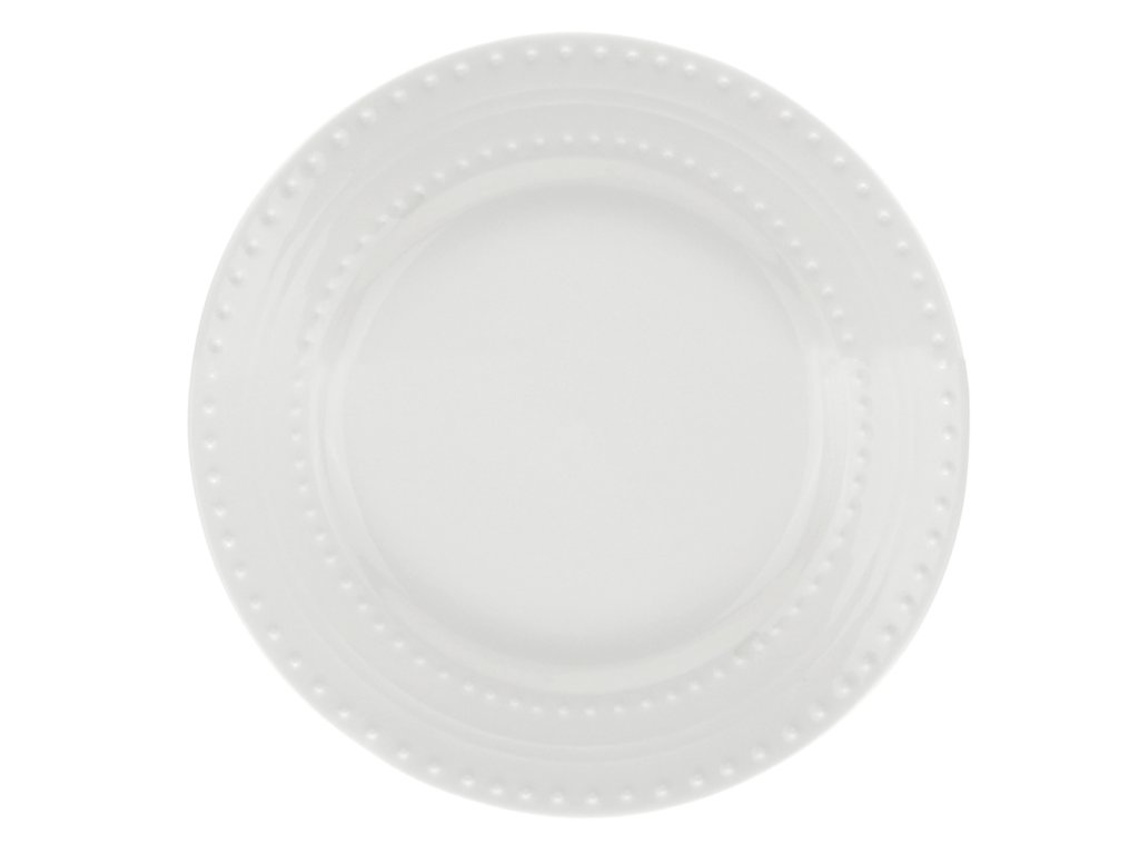 Kulatý porcelánový talíř s nádechem do smetanové barvy a jemným plastickým vzorem. Okraje talířů jsou zdobené plastickým dekorem puntíků a linek.