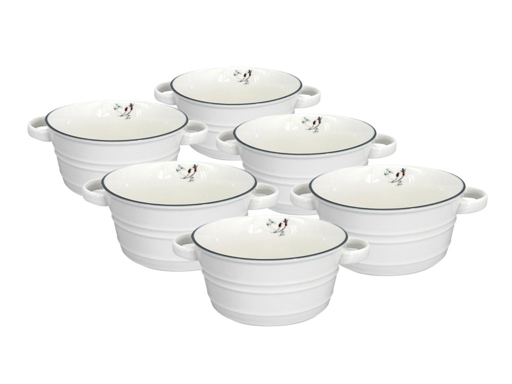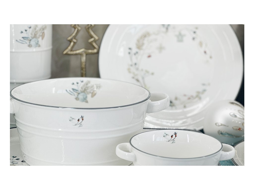Kolekce Vánoční Nostalgie v sobě snoubí krásu a praktičnost. Tato sada misek o průměru 12 cm je vyrobena z kvalitního porcelánu s jemným smetanovým nádechem, doplněna elegantním šedým proužkem. Vánoční dekor zdobí jemné motivy větviček, šišek a drobných ozdob v barvách sněhové zelenomodré, zlaté a šedé.
